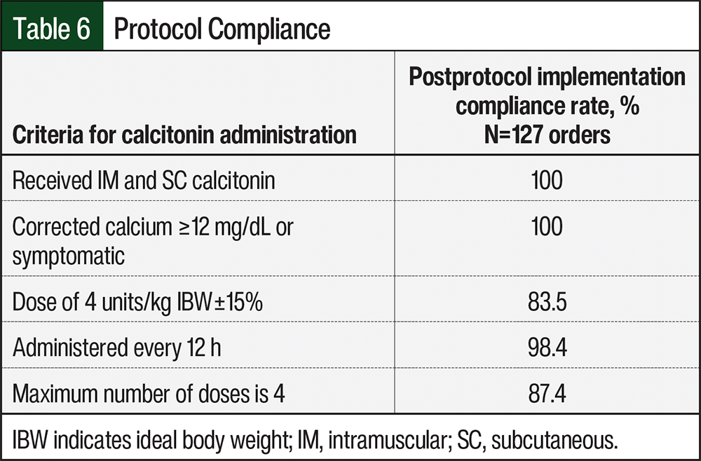 Protocol compliance was assessed with each of the 4 criteria to meet the administration of calcitonin. The restriction to the route of administration (IM and SC), as well as the restriction to give calcitonin only if the corrected calcium was ≥12 mg/dL or if the patient was symptomatic, was met at 100%. With the protocol implementation, 87.4% of orders were received, with a maximum of 4 calcitonin doses (Table 6). The dosing restriction criterion of calcitonin to 4 units/kg (±15%) was met in 83.5% of orders. The frequency of calcitonin to be given every 12 hours was met in 98.4% of orders. Table 6 shows details on the patients’ compliance to the protocol.