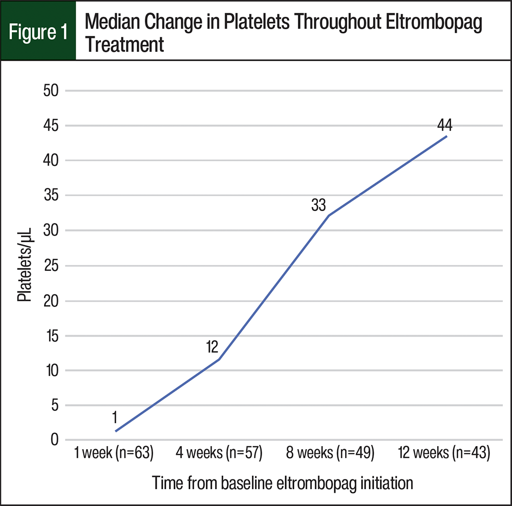 The median starting dose of eltrombopag was 50 mg (range, 25-150 mg) daily. There was no dosing protocol followed in this study, because eltrombopag was dosed based on the provider’s preference. The doses were titrated in 55 (82%) of the 67 patients, whereas 12 (18%) of the 67 patients received the same dose throughout the duration of their eltrombopag treatments. Notably, the doses were titrated even after the primary outcome of a platelet level of ≥50,000/µL was achieved in 11 (28%) of the 39 patients who achieved a response. The median dose at 1 week was 50 mg (range, 25-150 mg), and the median dose at each time point of 2 weeks, 3 weeks, and 4 weeks was 100 mg (range, 25-150 mg). At 8 and 12 weeks, the median dose of eltrombopag was 150 mg (range, 25-150 mg).