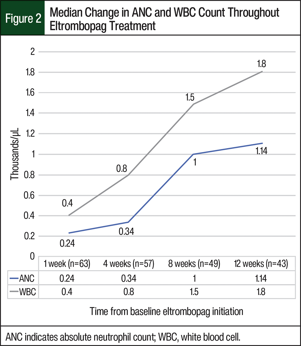 Notably, the median increases in blood counts from baseline to 12 weeks of receiving eltrombopag were 0.9 mg/dL for hemoglobin, 1140 cells/µL for ANC, and 1800 cells/µL for the WBC count. After the discontinuation of treatment with eltrombopag, platelets continued to increase. The median platelet count 2 to 4 weeks after the discontinuation of treatment with eltrombopag increased from the median platelet count of 65,000/µL at 12 weeks (10,000-280,000/µL) to 105,000/µL (4000-344,000/µL).
