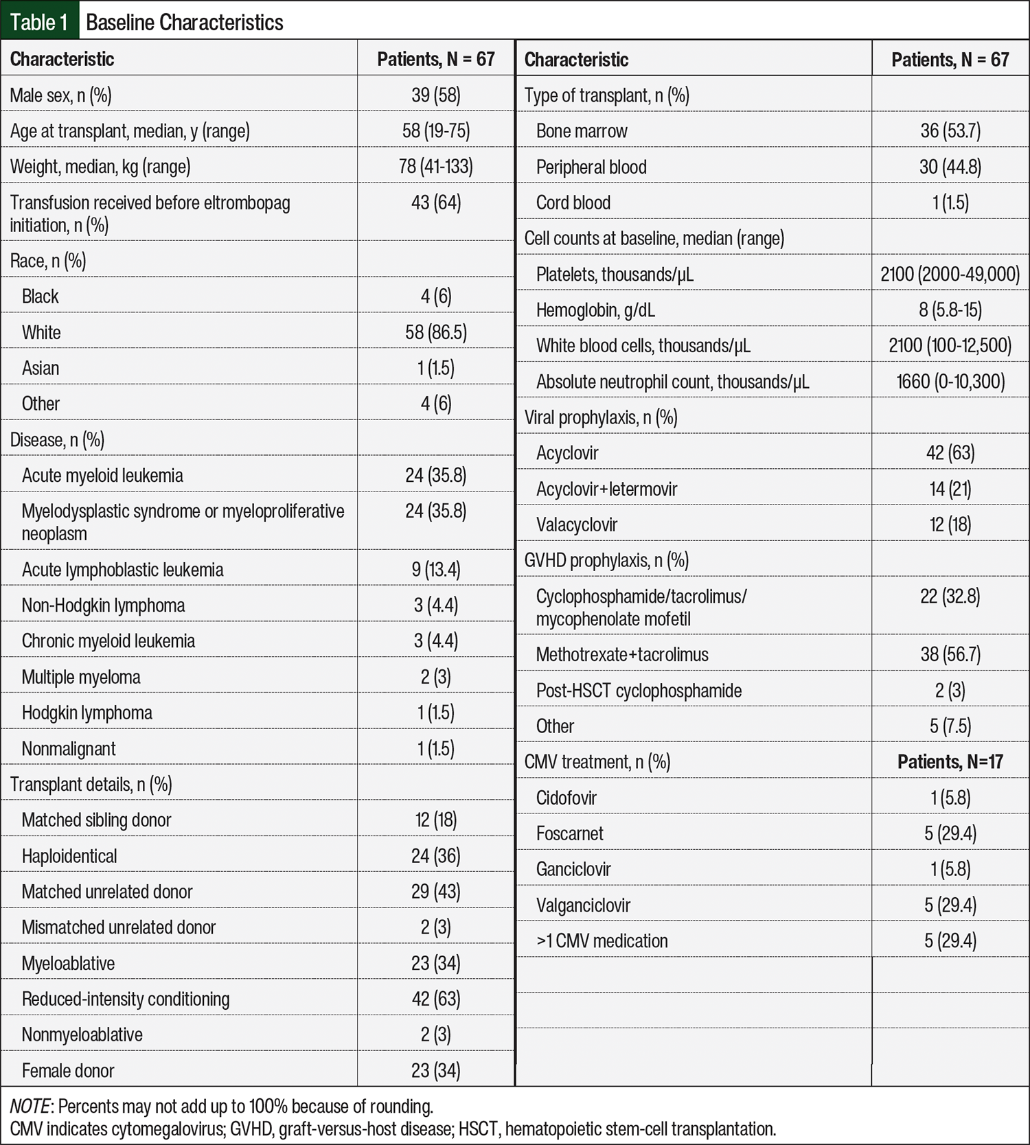 Between January 1, 2017, and August 30, 2021, 74 patients met the inclusion criteria and received eltrombopag for the treatment of posttransplant thrombocytopenia. Of these 74 patients, 7 patients were excluded from the study because they received the transplant at an outside health system (n=1), eltrombopag was initiated >4 years after having a transplant (n=1), they had an inability to swallow eltrombopag at any point during the study (n=3), and their laboratory monitoring was done at an outside health system (n=2). A total of 67 patients were included in the final retrospective analysis (Table 1). There were 39 (58%) men, and the median age at the time of transplant was 58 years (range, 19-75 years). The leading indications for transplant in the 67 patients were acute myeloid leukemia and myelodysplastic syndrome (n=24 [35.8%] each). The source of stem cells in this population was largely bone marrow in 36 (53.7%) patients and peripheral blood in 30 (44.8%) patients, but 1 (1.5%) patient received a cord blood transplant. The conditioning regimens included reduced intensity in 42 (63%) patients, myeloablative in 23 (34%) patients, and nonmyeloablative in 2 (3%) patients.