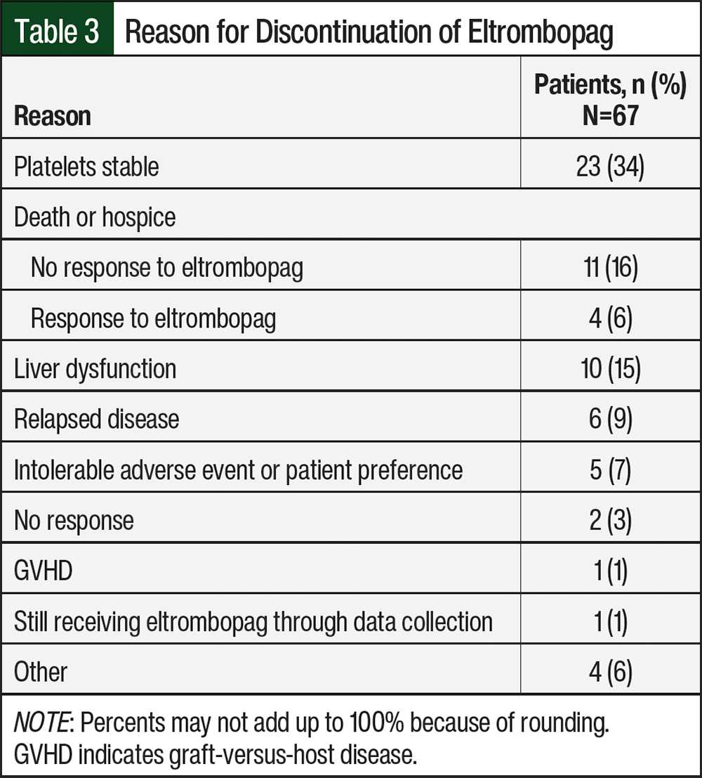 There were no statistical differences in the subgroup analysis comparing the response rates with GVHD history, the initiation of treatment with eltrombopag before or after 3 months in the posttransplant period, cytomegalovirus treatment, or the type of transplant (Table 2). In the 67 patients, the most common reasons for the discontinuation of treatment with eltrombopag included platelets being deemed stable by the provider in 23 (34%) patients, death or hospice in 15 (22%) patients, and hyperbilirubinemia in 10 (15%) patients (Table 3).