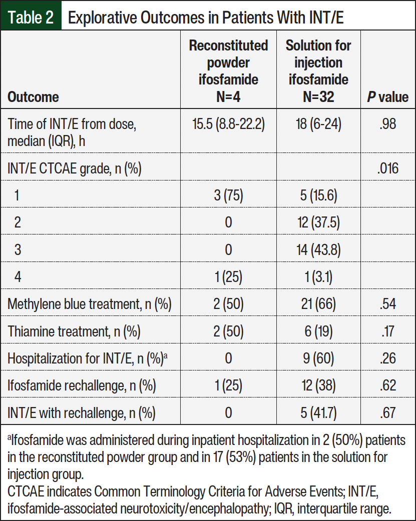 For the primary outcome, approximately 17% of patients in the overall population had INT/E. When broken down by cohort, the incidence of INT/E was significantly more common in the patients who received the solution for injection (n=32; 20.5%) compared with the powder for reconstitution (n=4; 7.1%), representing a number needed to harm of 7 (P=.022). When characterizing the exploratory outcomes in the patients who had INT/E, the time from the dose of ifosfamide to an AE was similar between the groups (15.5 hours vs 18 hours, respectively; P=.98; Table 2). Of the patients who had INT/E and received ifosfamide in the outpatient setting, 60% required hospitalization for AE monitoring and/or management, whereas none of the patients in the reconstituted powder group required inpatient admission. Grade 3 or 4 neurotoxic events (defined by the Common Terminology Criteria for Adverse Events, version 5.017) were significantly higher in the patients who received the solution formulation of ifosfamide versus the powder for reconstitution, with 15 (46.9%) of the 32 patients who had INT/E having grade 3 or 4 events (P=.016; Table 2).