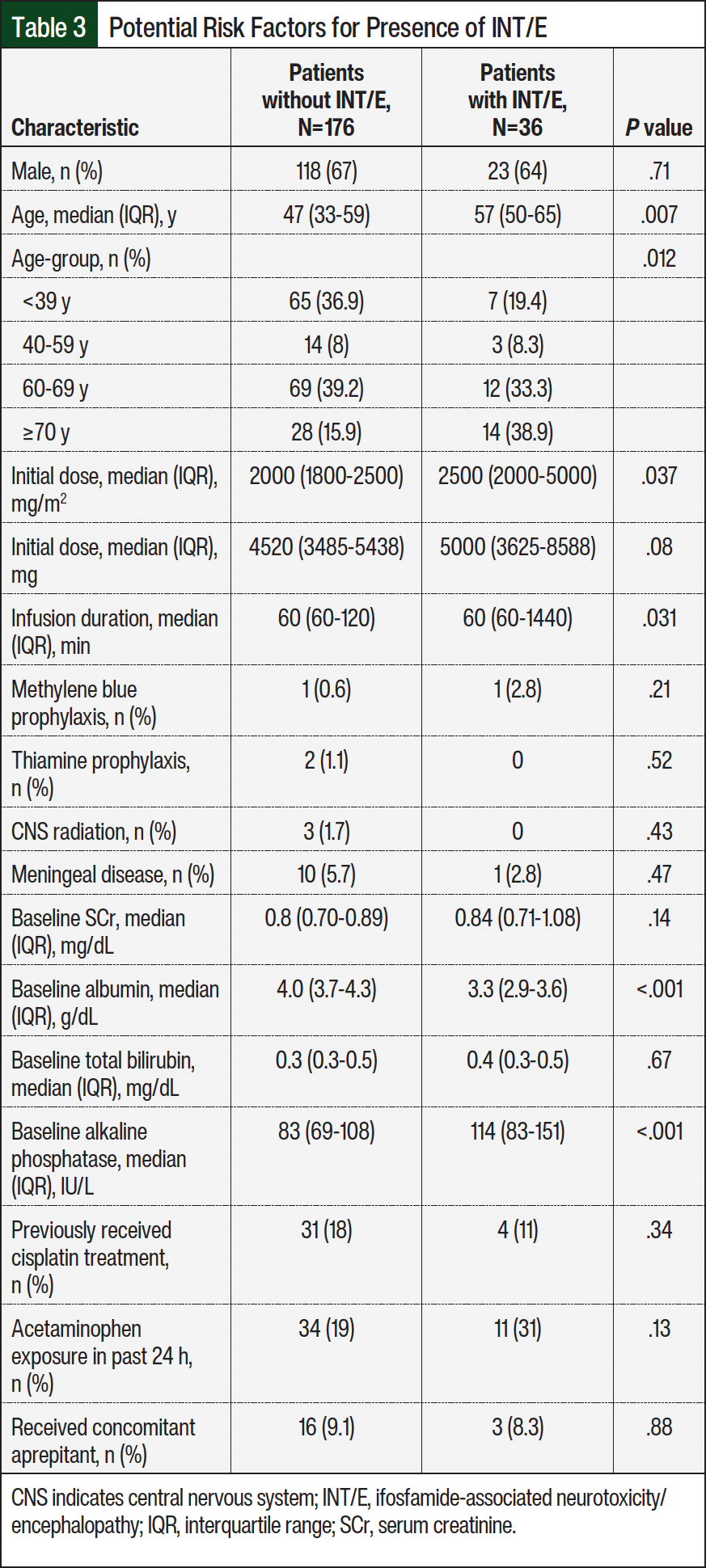 The secondary outcomes or additional risk factors for the presence of INT/E are shown in Table 3. The median age of the patients with INT/E was 57 years versus 47 years in those without INT/E (P=.007). Patients aged <39 years were less likely to have INT/E whereas patients aged >70 years were more likely to have INT/E (P=.012). Receiving higher daily doses of ifosfamide was also associated with increased rates of INT/E (P=.037). Other risk factors that resulted in a significant difference in the cohort with INT/E were longer infusion duration (P=.031), lower baseline albumin levels (3.3 g/dL vs 4 g/dL, respectively; P<.001), and higher baseline alkaline phosphatase levels (114 U/L vs 83 U/L, respectively; P<.001) with the solution for injection. The between-group differences noted for all other variables tested were not statistically significant, including other baseline demographics, the use of prophylaxis, central nervous system radiation, having meningeal disease, baseline serum creatinine and bilirubin, previous cisplatin exposure, recent acetaminophen use, or concomitant aprepitant administration.