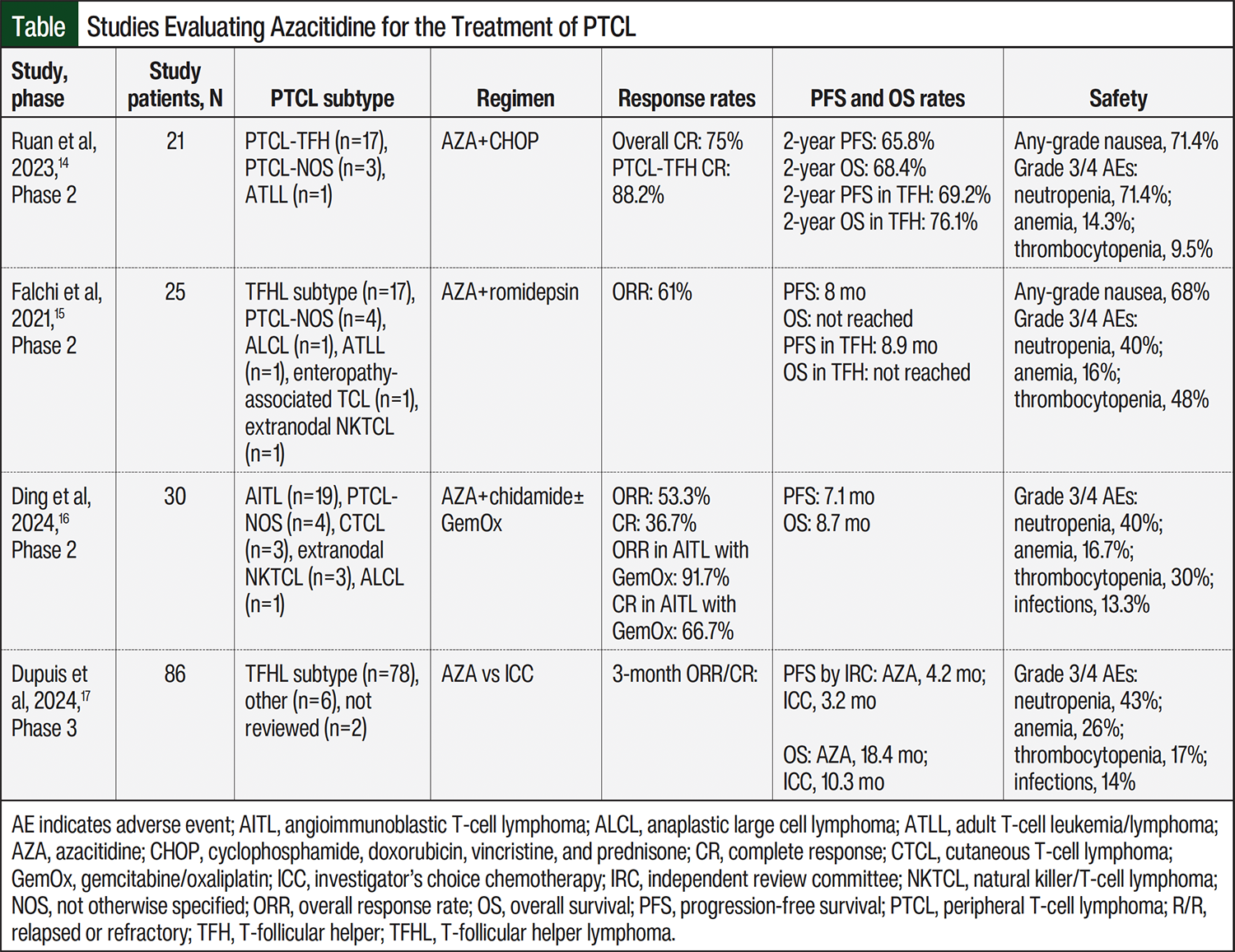 The Table lists several studies that evaluated the use of azacitidine for the treatment of PTCL.14-17 A multicenter, open-label, single-arm, phase 2 study evaluated the efficacy and safety of oral azacitidine plus standard CHOP in patients with treatment-naïve nTFHL, which included PTCL-TFH, PTCL-not otherwise specified (NOS), and T-cell leukemia or lymphoma in adults.15 Azacitidine was initiated as a priming dose of 300 mg orally per day for 7 days before cycle 1, day 1 of CHOP. Oral azacitidine 300 mg daily was then administered on days 8 to 21 during CHOP cycles 1 to 5. The primary efficacy end point was CR at the end of treatment. The secondary end points included PFS and overall survival (OS).15