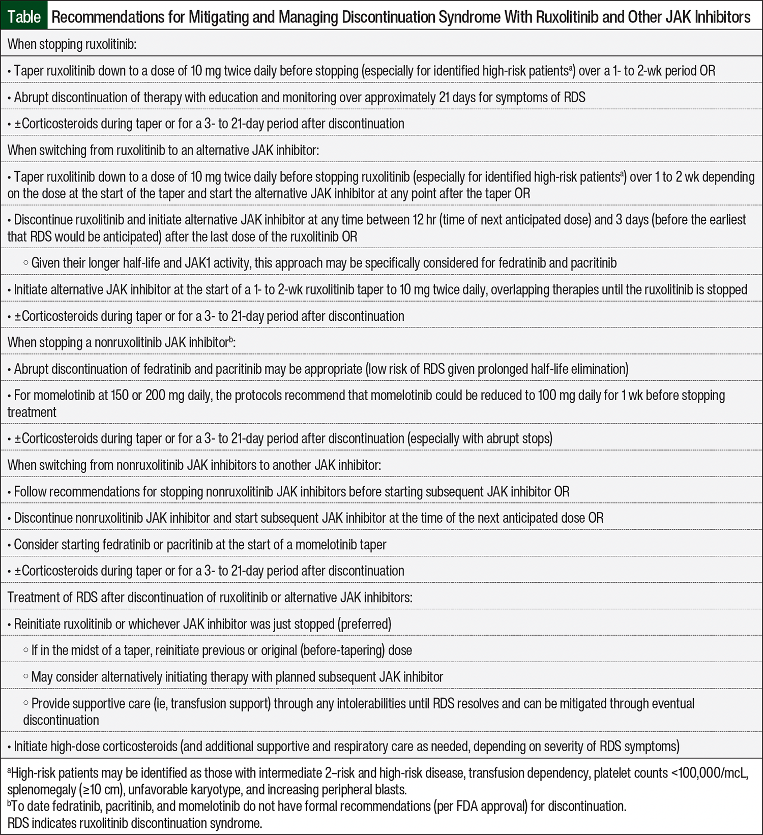There are no standard guidelines for the prevention of RDS or standard recommendations for the management of its manifestations. To avoid the continued and serious complications of RDS symptoms, clinical trial investigators have recommended careful tapering under supervision since the identification of this complication, which reflects common practice.5,8 Avoiding the sudden discontinuation of ruxolitinib is a primary measure that can be used to prevent the occurrence of discontinuation syndrome. Prescribers may seek to taper doses by 5 to 10 mg daily over a 14-day period to a target of at most 10 mg twice daily (if not to a lower dose), especially in patients who have a high risk for rebound symptoms (high disease burden or refractory disease) or in patients who are deemed frail (Table). This may be difficult depending on the current dosing and tablet size and may require a new prescription to achieve. Administering prophylactic corticosteroids either during a taper or for a period of time after discontinuation has also been reported in real-world practice.1,5 Stopping ruxolitinib soon before the start of conditioning for allogeneic hematopoietic stem-cell transplantation may also prevent RDS.5