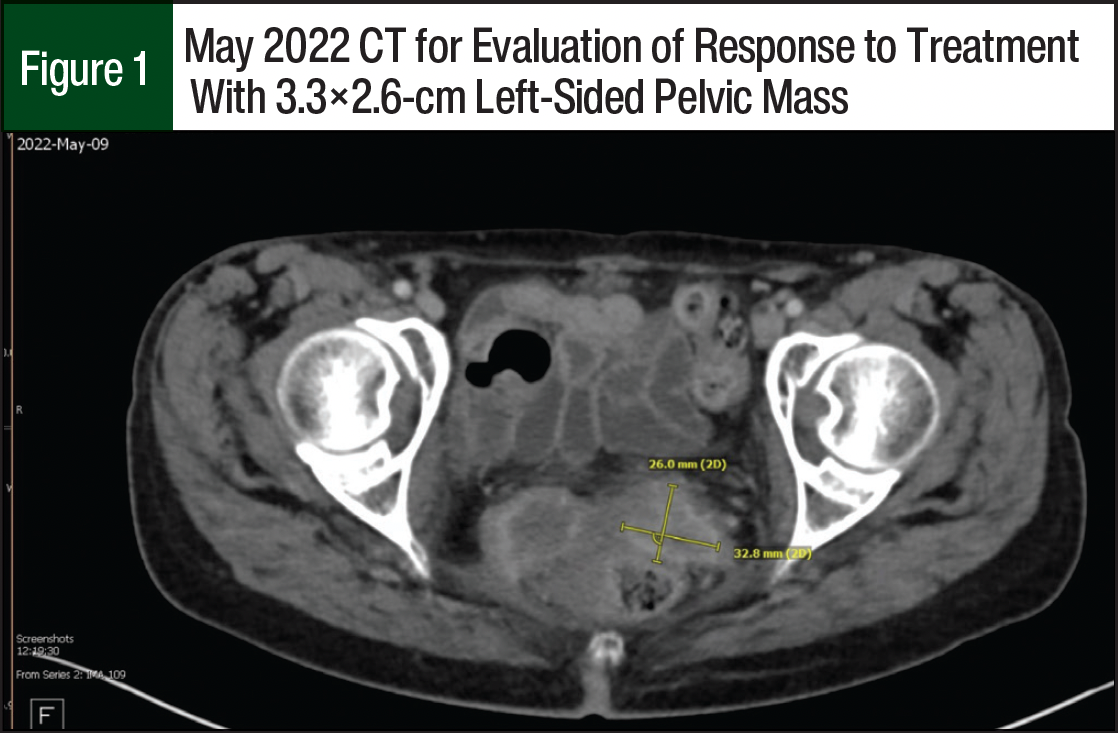 A restaging CT in May 2022 showed small progression of disease with a left-sided pelvic mass measuring 3.3×2.6 cm (Figure 1) and a right-sided pelvic mass measuring 3.7×3.5 cm. The team considered the patient to have stable disease, and the patient received an additional 6 cycles of pembrolizumab. In August 2022, a restaging positron emission testing/CT showed a continued increase in the size of the right-sided pelvic mass now measuring 6.9×4.4 cm; and the pulmonary metastases were not metabolically active. Because of this pelvic disease progression, tisotumab vedotin was added to the current therapy.