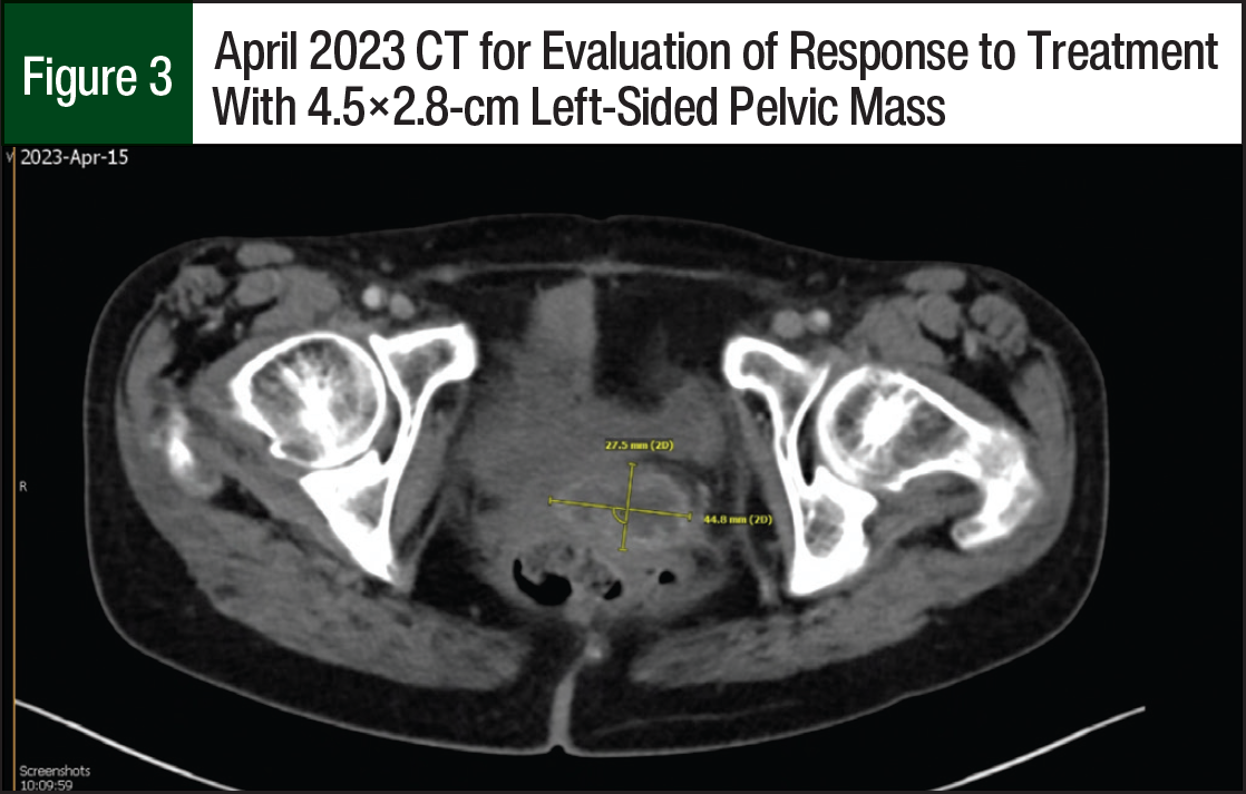 The patient started receiving treatment with tisotumab vedotin 2 mg/kg and pembrolizumab 200 mg IV every 3 weeks. After 6 cycles of the new regimen, a CT scan showed her left-sided pelvic mass decreased in size and now measured 2.9×1.2 cm (Figure 2) and that there was no new metastatic disease. Another CT scan was obtained after an additional 4 treatment cycles, which showed an interval increase in the left-sided pelvic mass that now measured 4.5×2.8 cm (Figure 3), and an unchanged pulmonary nodule signifying that her distant disease appeared to be well controlled. The patient continued systemic treatment and was referred to interventional radiology for pelvic embolization. To date, the patient has received 12 treatment cycles of tisotumab vedotin and pembrolizumab. She has tolerated the regimen well and only had mild dry eye; laboratory testing showed that she also had hypomagnesemia and hypokalemia.