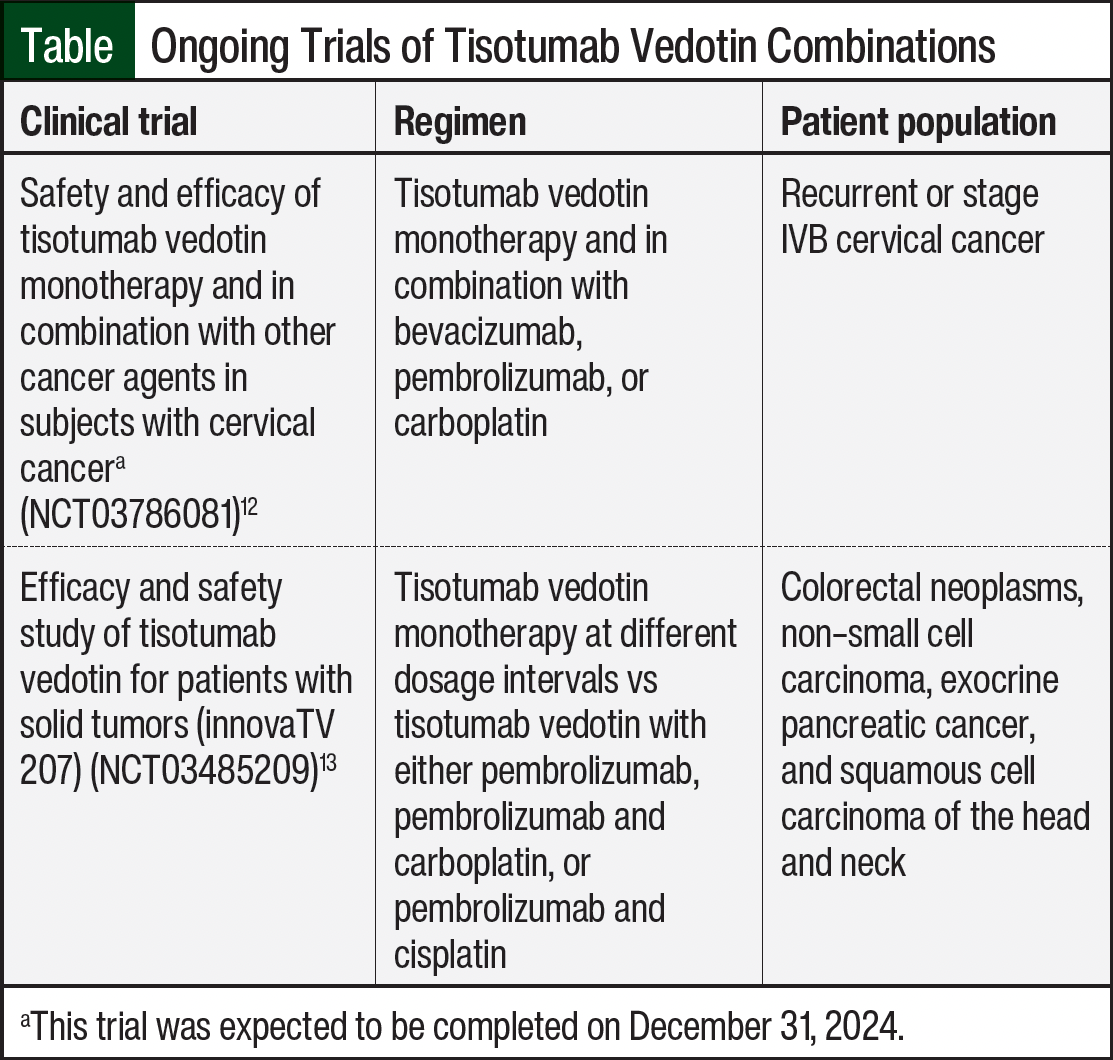 Currently, tisotumab vedotin is being studied in combination with pembrolizumab for the treatment of relapsed or metastatic cervical cancer in patients who had not received systemic therapy, excluding chemoradiation.7 Tisotumab vedotin was administered at a dose of 2 mg/kg IV, and pembrolizumab was dosed at 200 mg IV every 3 weeks. A total of 32 patients were included in the interim analysis, and the ORR was 41%. In all, 3 (9%) patients had a complete response and 10 (31%) had a partial response. The median progression-free survival was 5.3 months, and the median OS was not reached. The most common AEs during treatment included alopecia (61%), diarrhea (55%), epistaxis (49%), conjunctivitis (46%), and nausea (46%). Based on these interim results, the use of tisotumab vedotin with pembrolizumab may offer antitumor activity with an expected AE profile.7