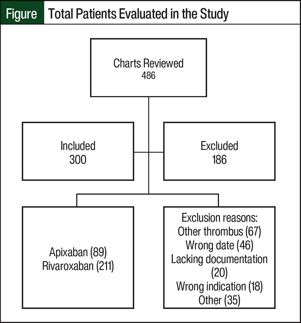 A total of 486 patients were evaluated to receive apixaban or rivaroxaban between 2017 and 2021 (Figure). Of these patients, 186 were excluded mainly because they had VTEs other than DVT or PE. Thus, the study included 300 patients, with 89 (30%) patients in the apixaban group and 211 (70%) in the rivaroxaban group.