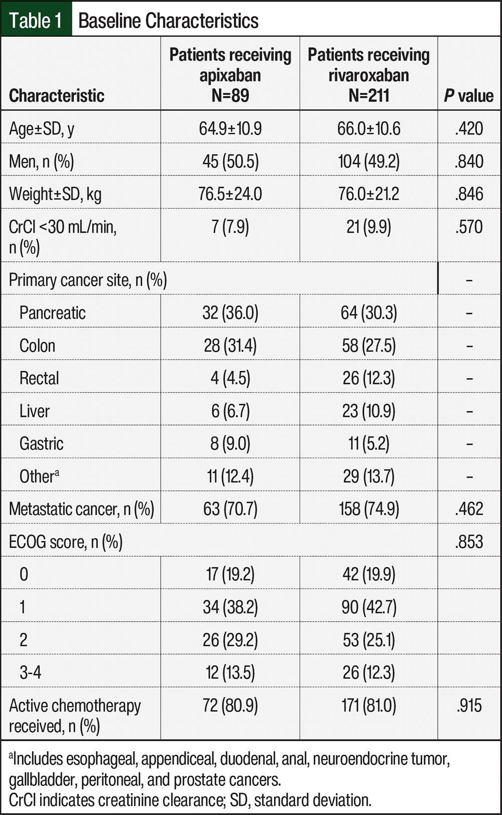 The patients’ baseline characteristics are shown in Table 1. Of these 300 patients, 70.7% and 74.9% had metastatic cancer in the apixaban and rivaroxaban groups, respectively. Most patients from each group were receiving active chemotherapy (80.9% and 81%, respectively). The most common cancers were pancreatic (36%) and colon (31.4%) in the apixaban group and pancreatic (30.3%), colon (27.5%), and rectal (12.3%) in the rivaroxaban group. The median patient age was 65.5 years, which was similar in both groups.