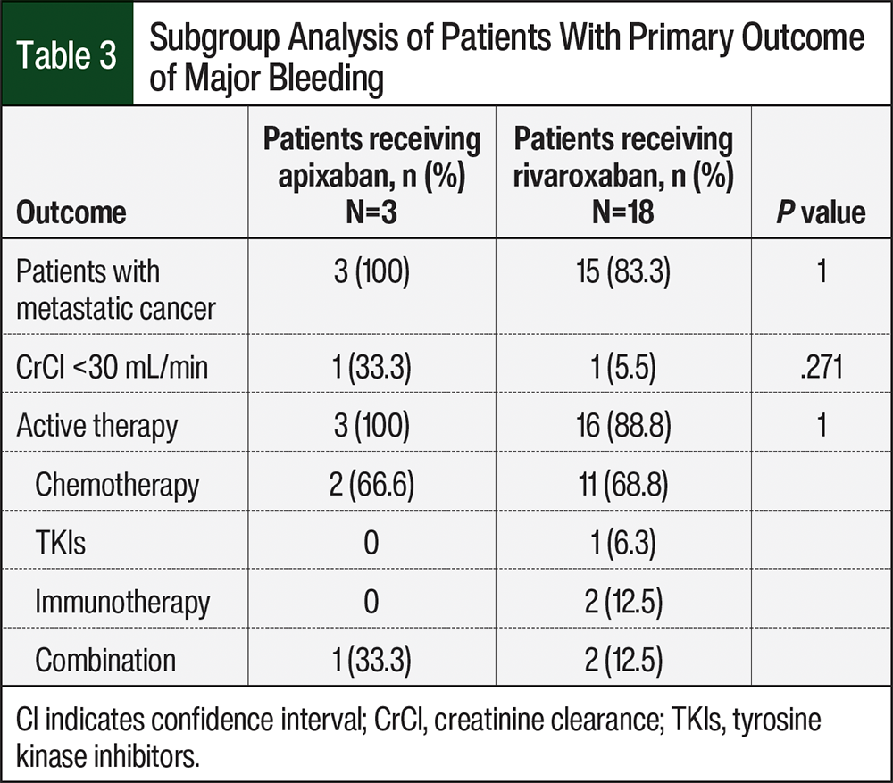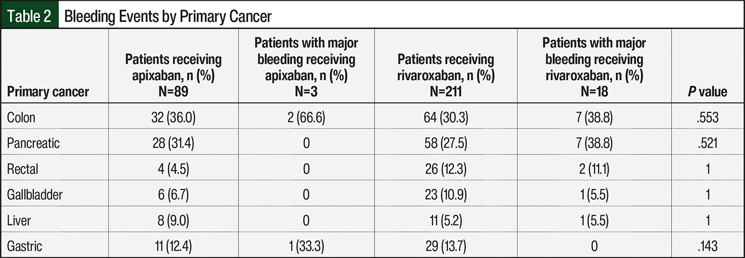 The primary outcome of major bleeding occurred in 3 of 89 (3.4%) patients in the apixaban group and in 18 of 211 (8.5%) patients in the rivaroxaban group (OR, 0.42; 95% CI, 0.13-1.37; P=.152). The median follow-up time was 23.8 months (range, 1.5-60.3 months). A subgroup analysis of major bleeding showed that patients with colon cancer had more major bleeding with apixaban than with rivaroxaban (66.6% vs 38.8%, respectively; P=.553; Table 2). Further analysis showed that patients with pancreatic cancer had more major bleeding events with rivaroxaban than with apixaban (38.8% vs 0%, respectively; P=.521; Table 2). All 3 patients who had major bleeding in the apixaban group had metastatic cancer and were receiving active treatment compared with the rivaroxaban group, which had 15 (83.3%) patients with metastatic cancer and 16 (88.8%) patients receiving active treatment who had a bleeding event (Table 3). There was no statistical difference in any of our primary outcomes between the groups.