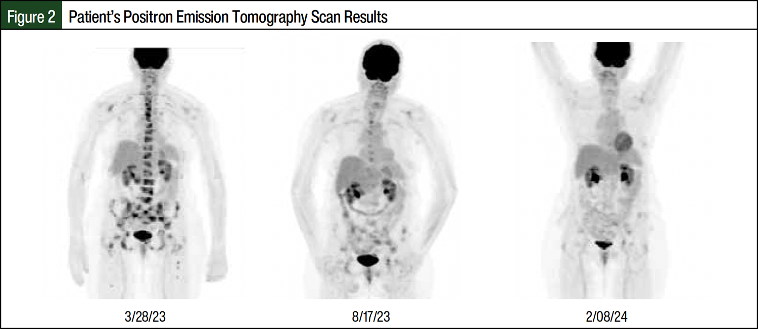 In May 2023, the patient’s treatment regimen was changed to ribociclib 600 mg daily with monthly injections of fulvestrant and denosumab because abemaciclib was not tolerated as a result of severe nausea, vomiting, and diarrhea. In September 2023, the dose of ribociclib was lowered to 400 mg daily because the patient’s absolute neutrophil count was 0.69 cells/mm3. As of the writing of this article, the patient has been receiving treatment for 20 months and is currently tolerating it well. She has had a remarkable decrease in her CEA level as well as a continual regression of cancer on her PET scans (Figure 1 and Figure 2). The CEA values in Figure 1 can be compared with the patient’s CEA level of 1.1 in 2019. Her pain scores dropped from an 8 to a 1 or 2, and she was able to resume activities of daily living. Before her diagnosis and treatment, the patient received consistent nonsteroidal anti-inflammatory drug therapy, used a walker to walk any distance, and received weekly acupuncture sessions for pain management. Now, she does not require any medication for pain. Her eosinophil rate has decreased from 10.9% before treatment to 2.2% after treatment.