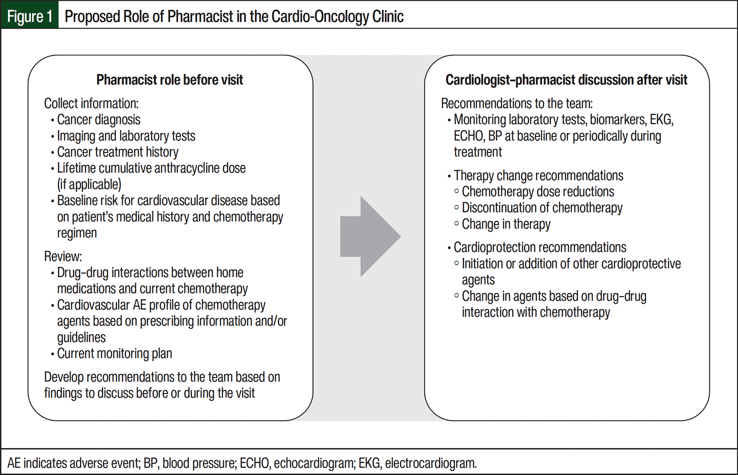 The field of cardio-oncology originated to fulfill the need for prevention, diagnosis, surveillance, and management of cardiovascular disease in patients who were undergoing or completed cancer treatment.2,6 To deliver high-quality patient-centered care, clinicians must collaborate and implement treatment strategies based on recently published guidelines, expert opinion, and clinical judgment. Implementation of a multidisciplinary approach in the cardio-oncology field allows for shared decision-making, better patient outcomes, and improved knowledge in a field that combines 2 specialties: oncology and cardiology.2,3,6 Healthcare professionals who may be part of a cardio-oncology program include cardiologists, medical oncologists, mid-level practitioners, pharmacists, nurses, dietitians, and social workers.6 Information regarding the role of the oncology pharmacist in the setting of cardiovascular disease secondary to cancer therapy is limited. However, oncology pharmacists can play a unique role in this field by providing in-depth knowledge of intravenous and oral oncolytic therapies (including AE profiles), evaluating the potential for drug interactions, managing AEs, monitoring the efficacy and safety of medications,2,3 and educating patients and healthcare team members.