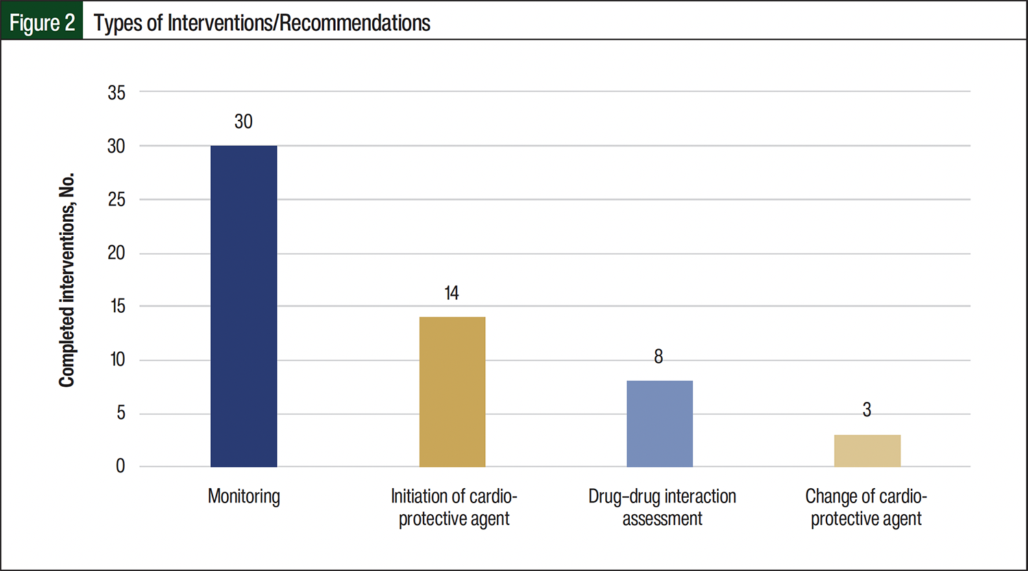Of the 47 patients who received interventions, 39 (83%) patients had 1 intervention, and 8 (17%) patients had 2 interventions completed by the pharmacist per visit. All interventions done by the pharmacist were accepted by the team. In addition, 10 (17.5%) patients of the cohort of 57 patients had no interventions, but baseline assessments and documentation were still completed in the EMR for future reference. The average chart-review time spent before clinic visits was 40 minutes, with a total of approximately 60 minutes when taking into account the clinic visits and final changes in the recommendations based on visit findings and discussion with the cardiologist. Given this time limitation, chart review was prioritized to patients on active treatment, hematopoietic stem cell transplant recipients, and patients who are childhood and adolescent cancer survivors. No cancer therapy was discontinued secondary to cardiovascular disease during the pilot project.