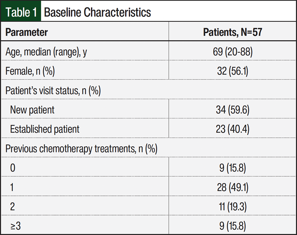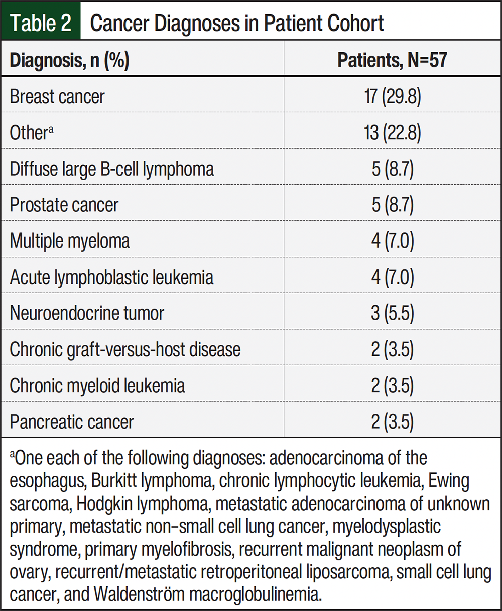 A total of 118 patients were seen in the cardio-oncology clinic during 10 clinic days from February 5, 2024, to March 8, 2024. Documentation was completed on 57 patients due to time constraints in chart review, and 2 patients were evaluated by the pharmacists outside of the clinic and were excluded from the final analysis. Clinic patients’ demographic information is found in Table 1. The most common cancer diagnosis was breast cancer, followed by diffuse large B-cell lymphoma and prostate cancer (Table 2).