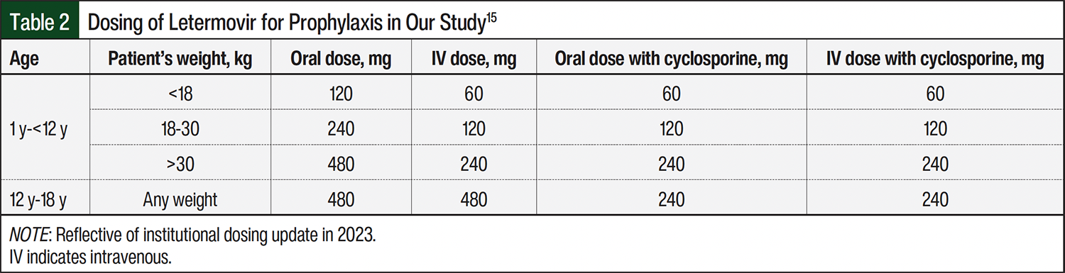 In addition, per the clinical trial’s dosing protocol (NCT03940586), IV letermovir dosing was not reduced when received concomitantly with cyclosporine.15 Cyclosporine decreases letermovir hepatic uptake via cyclosporine-mediated inhibition of organic anion-transporting polypeptide 1B1/3 transporters, which subsequently can increase letermovir serum concentrations.6 For patients aged >12 years, IV and oral letermovir doses are decreased by 50% when given with cyclosporine.6,16 Most of our patients received dosing using an IV-to-oral conversion of 1 to 1 regardless of calcineurin inhibitor used, based on studies with adults.6,15 The dosing proposed in the clinical trial (NCT03940586) that suggested the IV-to-oral conversion should be 1 to 2 in patients aged <12 years who were not receiving concomitant cyclosporine was confirmed, based on the study’s interim analyses of pharmacokinetics, safety, and tolerability, which led to our dosing practice change.6,15 Although our historical institutional practice did not underdose patients, it may have led to unnecessary overexposure of patients to letermovir. Based on the preliminary pharmacokinetic results of the phase 2b clinical trial,15 effective and safe serum drug exposure can be achieved using the FDA-approved pediatric dosing of letermovir with a more specific dose-banded weight strategy for patients who weigh <15 kg (body weight of 7.5 to <15 kg and 6 to <7.5 kg).6,16