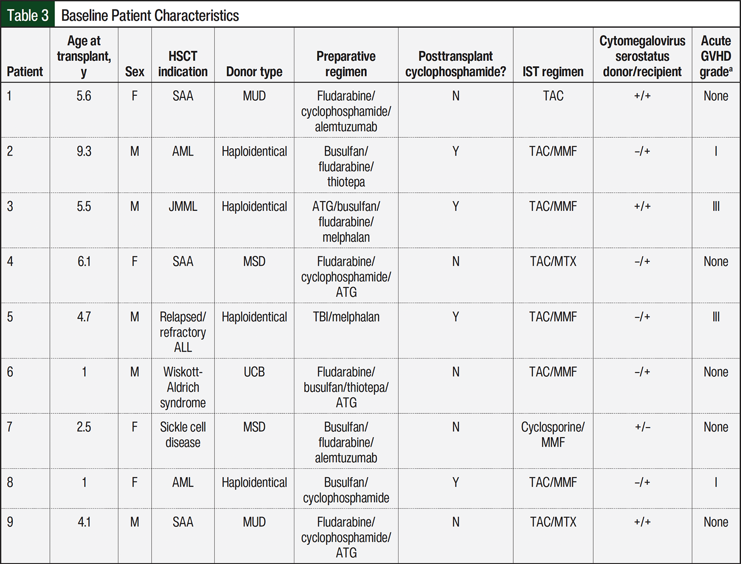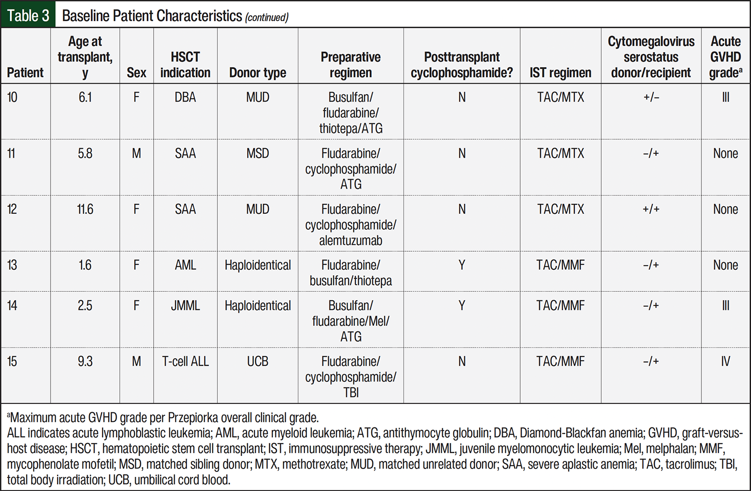 From December 1, 2022, to May 31, 2024, there were 40 allogeneic HSCT recipients who received letermovir for prophylaxis. Of those patients, 22 were excluded from this study because they were aged ≥12 years at the time of transplant, and 3 were excluded for not meeting the follow-up duration criteria. In all, 15 patients met the inclusion criteria for the cohort analysis (median age, 5.5 years; age range, 12 months-11.6 years). The patients’ baseline characteristics are shown in Table 3. None of the patients received a T-cell–depleted graft, and none had documented CMV end-organ disease or viremia before HSCT.