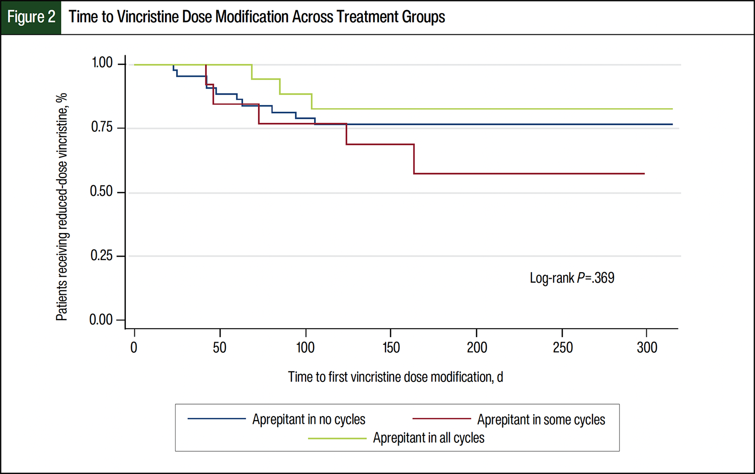 The largest cohort of patients represented those who did not receive aprepitant during any cycles (n=45, 57.7%), whereas 33 patients received aprepitant during any (n=20, 25.6%) or all cycles (n=13, 16.7%). The baseline characteristics were similar among the groups (Table). A total of 18 (23.1%) patients required vincristine dose modification across all groups, with an average of 3.7 cycles modified. The median percentage dose reduction (including dose omissions) was 50%. Of these patients, 11 tolerated re-escalation to the full dose after the resolution of AEs. The most common reasons for dose modification were peripheral neuropathy (n=11, 14.1%) and constipation/ileus (n=3, 3.8%).