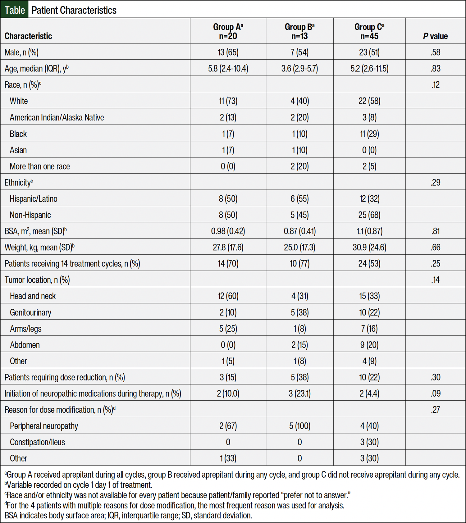 The patients were divided into 3 groups depending on the extent of aprepitant use: group A consisted of patients who received aprepitant during all vincristine, dactinomycin, and cyclophosphamide cycles; group B consisted of patients who received aprepitant during at least 1 cycle, but not all cycles, of vincristine, dactinomycin, and cyclophosphamide treatment; and group C consisted of patients who did not receive aprepitant during any cycles of vincristine, dactinomycin, and cyclophosphamide. The study’s primary end point was the rate of dose reduction secondary to vincristine-induced AEs in children who received aprepitant compared with children who did not have these AEs. The trial’s secondary end points were the incidence and severity of vincristine-induced AEs, as well as the use of new neuropathic medications.