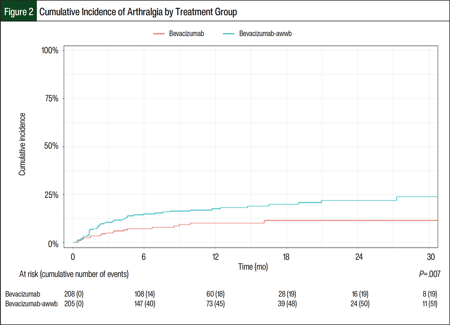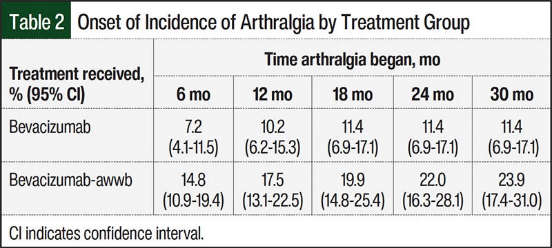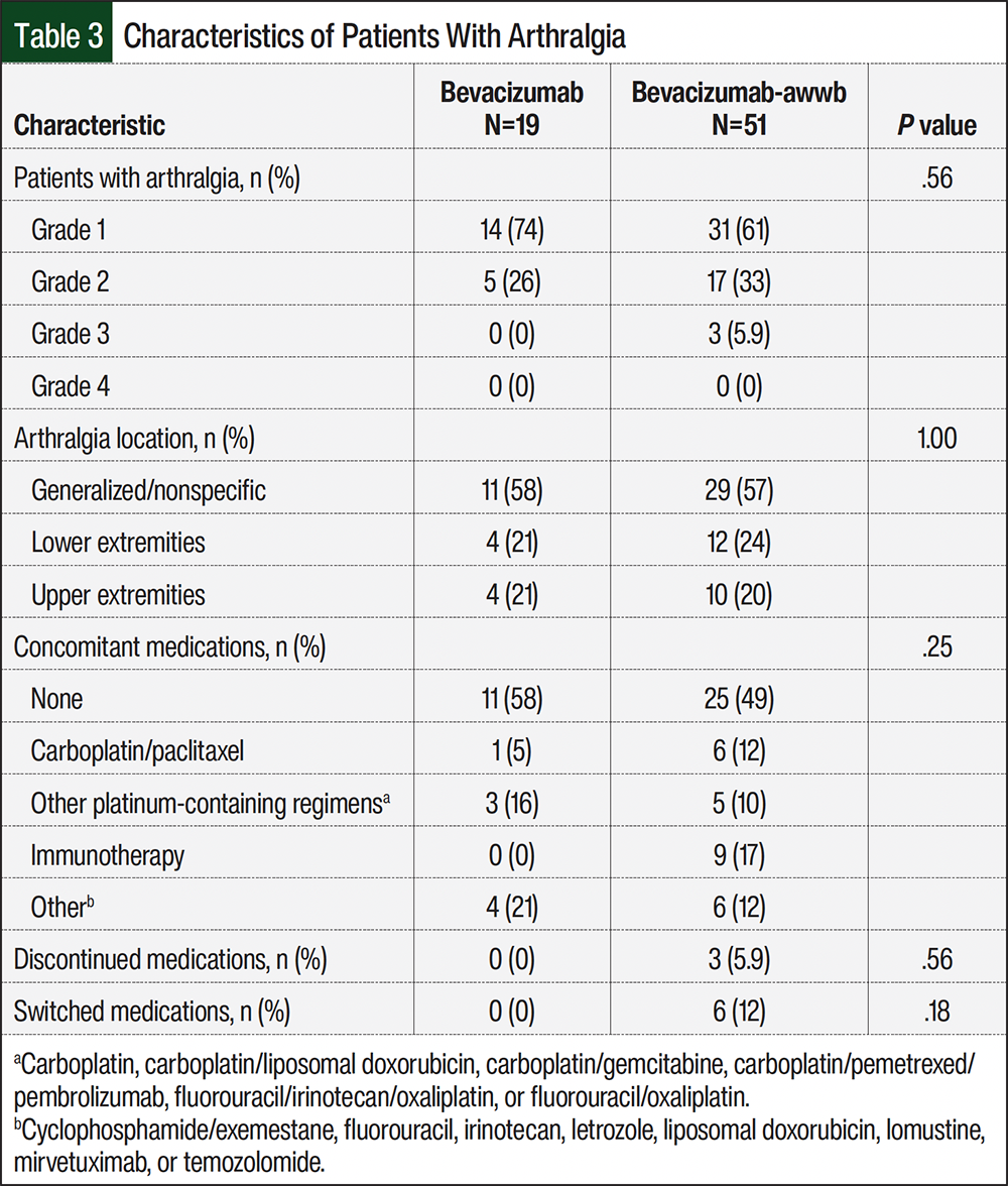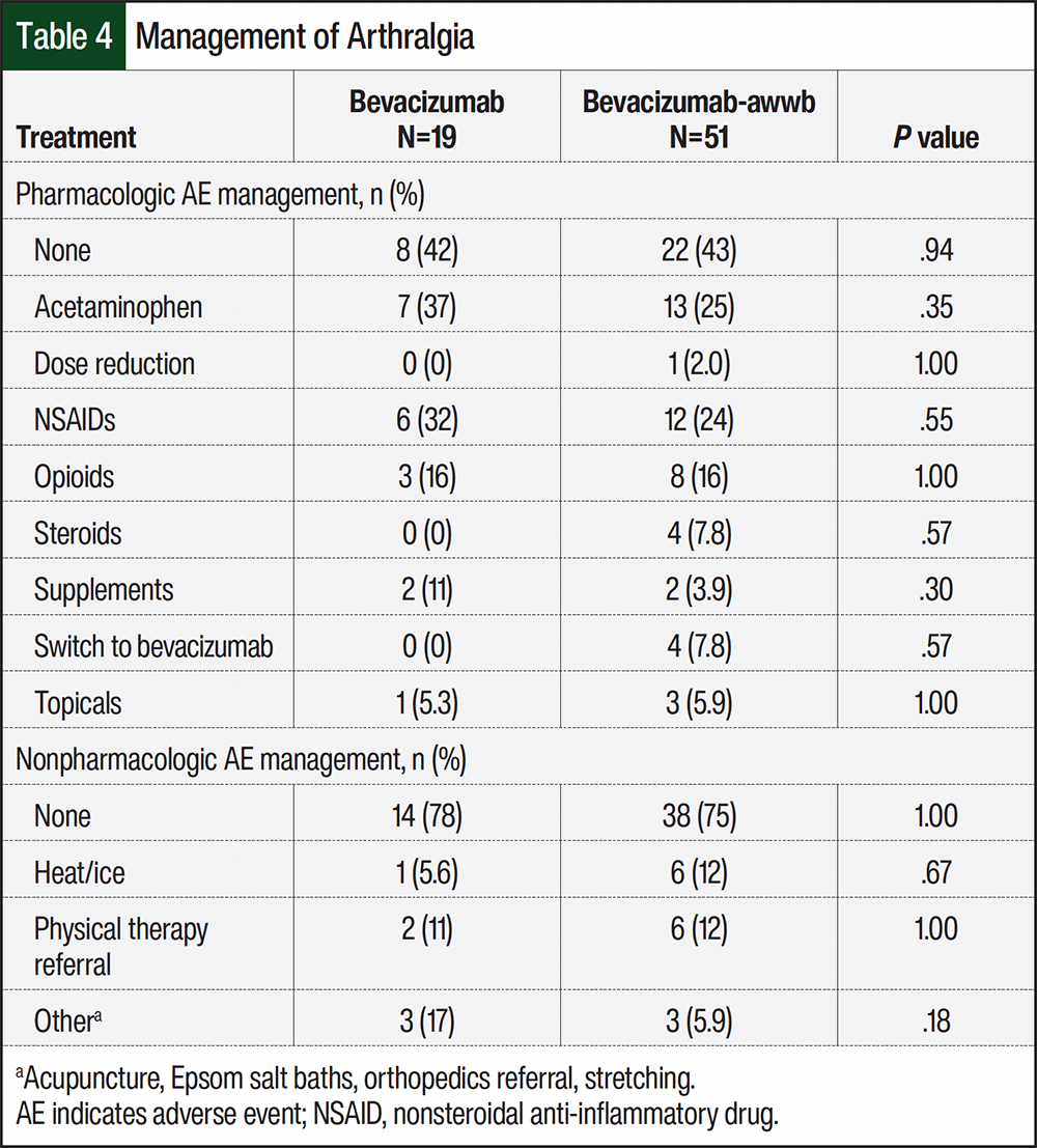 Data regarding the incidence and severity of arthralgia as an AE in patients receiving bevacizumab or bevacizumab-awwb are lacking. Although none of the patients in the bevacizumab group had grade 3 arthralgia, 3 patients in the bevacizumab-awwb cohort had grade 3 arthralgia, which shows that patients have more arthralgia with the biosimilar than the reference drug and that they are also having a higher severity of the AE. Early and sustained separation in the cumulative incidence curves for arthralgia represents an earlier onset of arthralgia in the bevacizumab-awwb group versus the bevacizumab group as well. With higher grading and severity of arthralgia, patients’ activities of daily living are further affected. AEs that negatively affect quality of life are of greater clinical significance and need proper management. An analysis completed within this study concerning the pharmacologic and nonpharmacologic management of arthralgia points to the need for guidance for the treatment of arthralgia, given that national guidelines do not have recommendations regarding arthralgia treatment related to cancer or chemotherapy. Guidance at an institutional or national level may lead to improved outcomes for patients and an ability to continue the proper treatment for their malignancy.