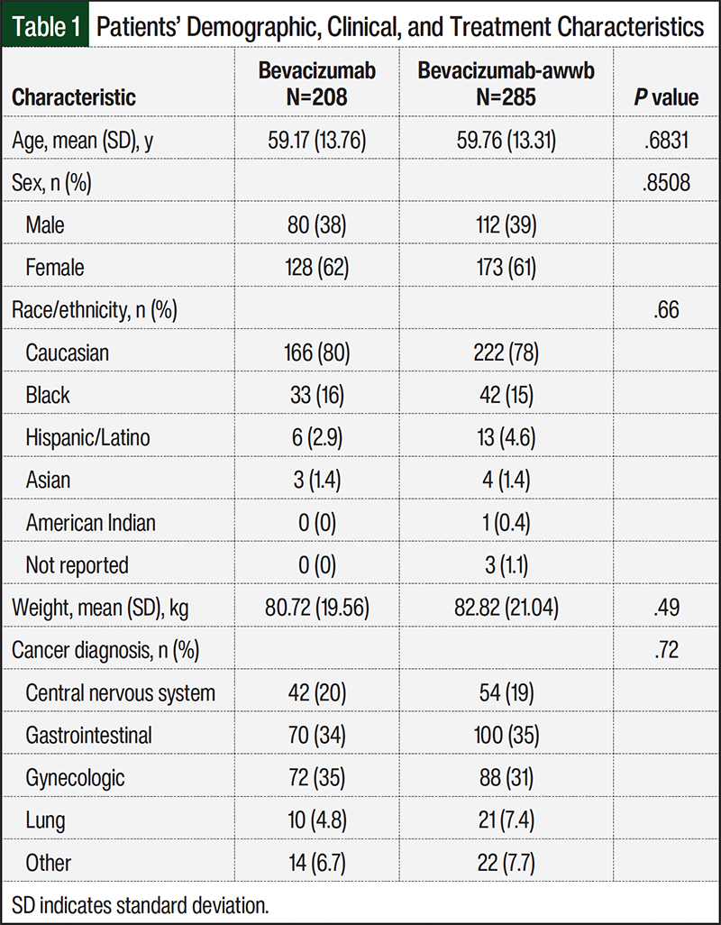 A total of 573 patients received bevacizumab or bevacizumab-awwb between July 1, 2017, and March 31, 2023, with close follow-up with an oncology provider. Of these patients, 493 patients were included in the study, with 208 in the bevacizumab arm and 285 in the bevacizumab-awwb arm (Figure 1). The baseline characteristics, including age, sex, race/ethnicity, weight, and cancer diagnosis, were similar between the groups (Table 1). Notably, most patients were receiving treatment for either a gastrointestinal or gynecologic malignancy. There was no significant difference between the groups regarding mortality (P=.8).