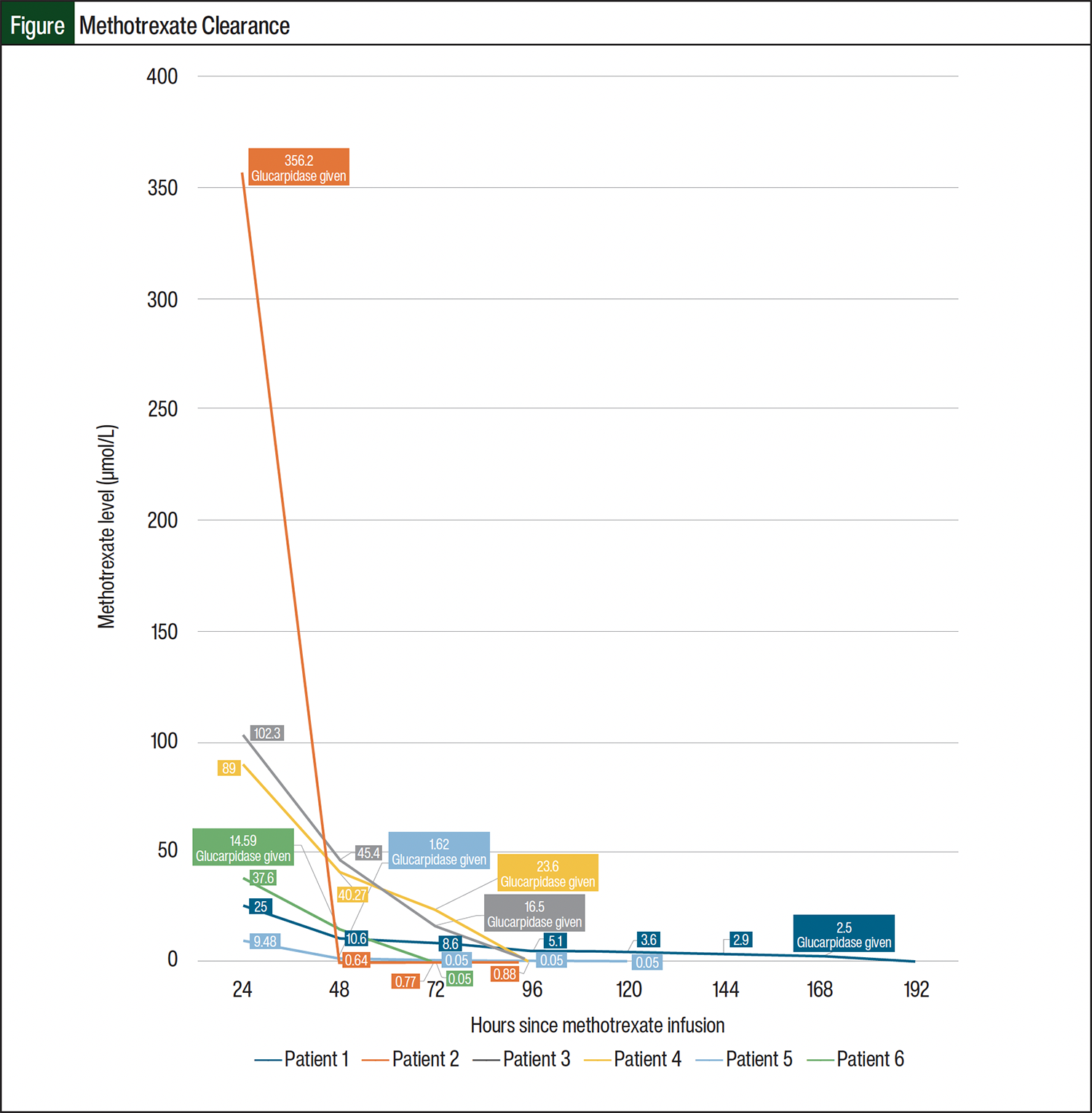 This study is a retrospective case series. Patients were included in the study if they were aged ≥1 year, received high-dose methotrexate, and received a single 1000-unit dose of glucarpidase between January 1, 2012, and April 1, 2023. Patients were excluded from the study if they were enrolled in a clinical trial of glucarpidase. The patients’ baseline demographic and clinical characteristics were collected through Epic electronic health record inquiries, including the associated Beacon (Epic Systems; Verona, WI) chemotherapy plan.