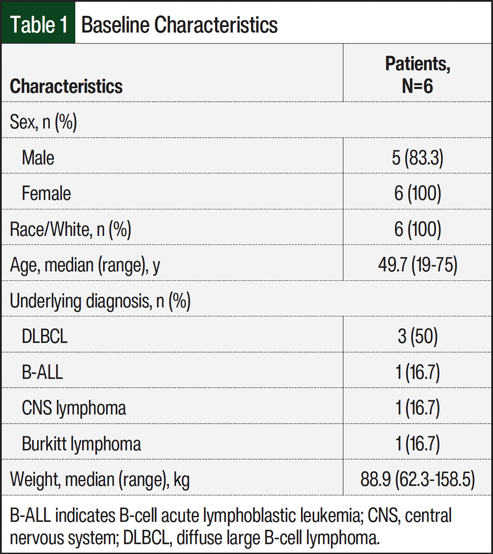 A total of 6 patients who received a flat dose of glucarpidase between January 2012 and April 2023 were included in the analysis. The patients’ baseline characteristics are shown in Table 1. The median patient age was 49.7 years, most of the patients were male (n=5, 83.3%), and all of the patients were White (n=6, 100%). The most common underlying diagnosis was diffuse large B-cell lymphoma (n=3, 50%). The median patient weight was 88.9 kg (range, 62.3-158.5 kg; Table 1).