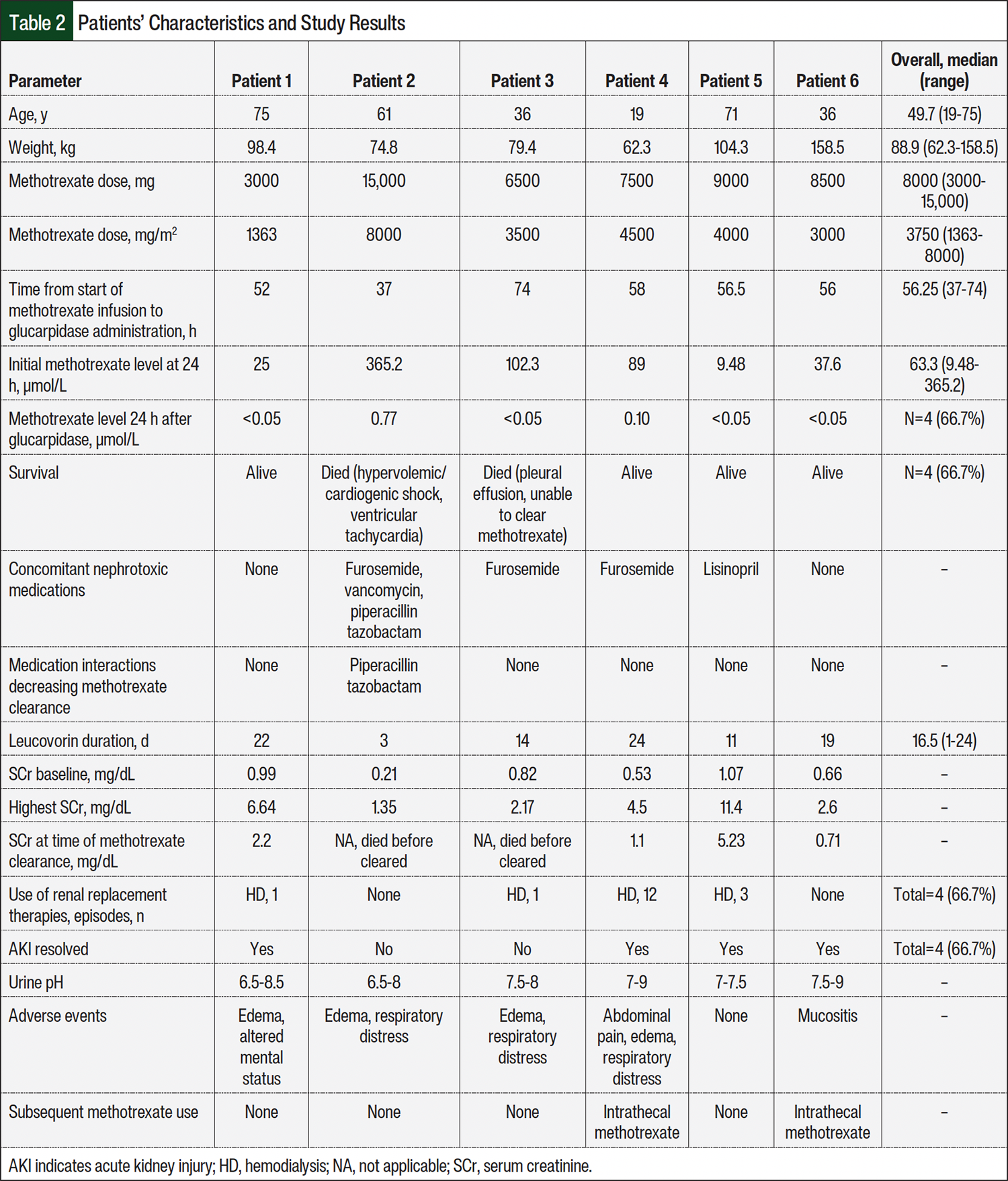 The overall survival rate was 66.7% (n=4); of the 2 patients who died, 1 died from unrelated cardiac complications that were present before methotrexate administration and 1 died from a pleural effusion and subsequent respiratory failure. These 2 patients who died were unable to clear methotrexate, but methotrexate-related AEs were not ruled as the cause of death. Methotrexate-related AEs and organ dysfunction could have certainly contributed to the death of both patients, but they died before the completion of care for the methotrexate-related AEs. Glucarpidase dosing was unrelated to the final outcomes of these 2 patients. The details of fluid status, urine pH, SCr levels, and the timing/dosing of methotrexate and leucovorin are shown in Table 2 and in the Appendix Table.