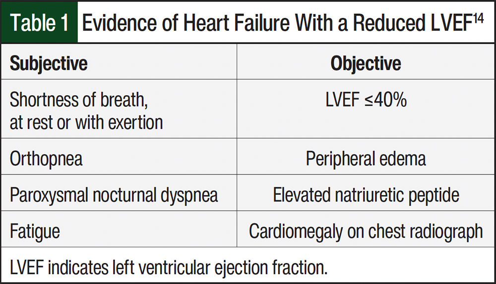Cardiotoxicity from trastuzumab is most likely to occur within 6 months of therapy initiation and is characterized by a decrease in LVEF.28 Trastuzumab-induced reduction of LVEF after completion of trastuzumab therapy has also been reported.12 For this reason, LVEF should be evaluated routinely before, during, and after treatment. Clinicians are recommended to complete a thorough history and screening regarding the patient’s cardiac status and previous cumulative chemotherapies, specifically anthracyclines because of the increased risk for cardiotoxicity.12 Table 1 provides objective and subjective signs of reduced LVEF that a patient with heart failure may display.14