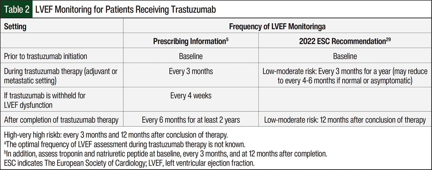 Consensus is lacking as to the ideal management of patients with a history of cardiac conditions or persistent cardiac dysfunction despite discontinuation of therapy. NCCN does not have specific monitoring recommendations; however, NCCN recommends follow-up based on patient cardiovascular risk assessments and manufacturer’s prescribing information.1 The prescribing information for trastuzumab recommends cardiac monitoring with echocardiography or multigated acquisition scan at baseline, every 3 months while on treatment and every 6 months following treatment for at least 2 years.5 The European Society of Cardiology (ESC) also published guidelines in 2022 that discuss monitoring recommendations for those on HER2-targeted therapies, such as trastuzumab.29 For low- to moderate-risk patients, there is a Class 1 recommendation for echocardiography at baseline, every 3 months during treatment for 12 months, and 12 months post treatment.29 For patients at high or very high risk, ESC recommends an additional echocardiogram at 3 months after completion of therapy in addition to the 12-month posttreatment echocardiography.29 Clinicians may choose to use echocardiography surveillance in patients who continue to receive trastuzumab long-term at an interval determined by their clinical judgment.12
