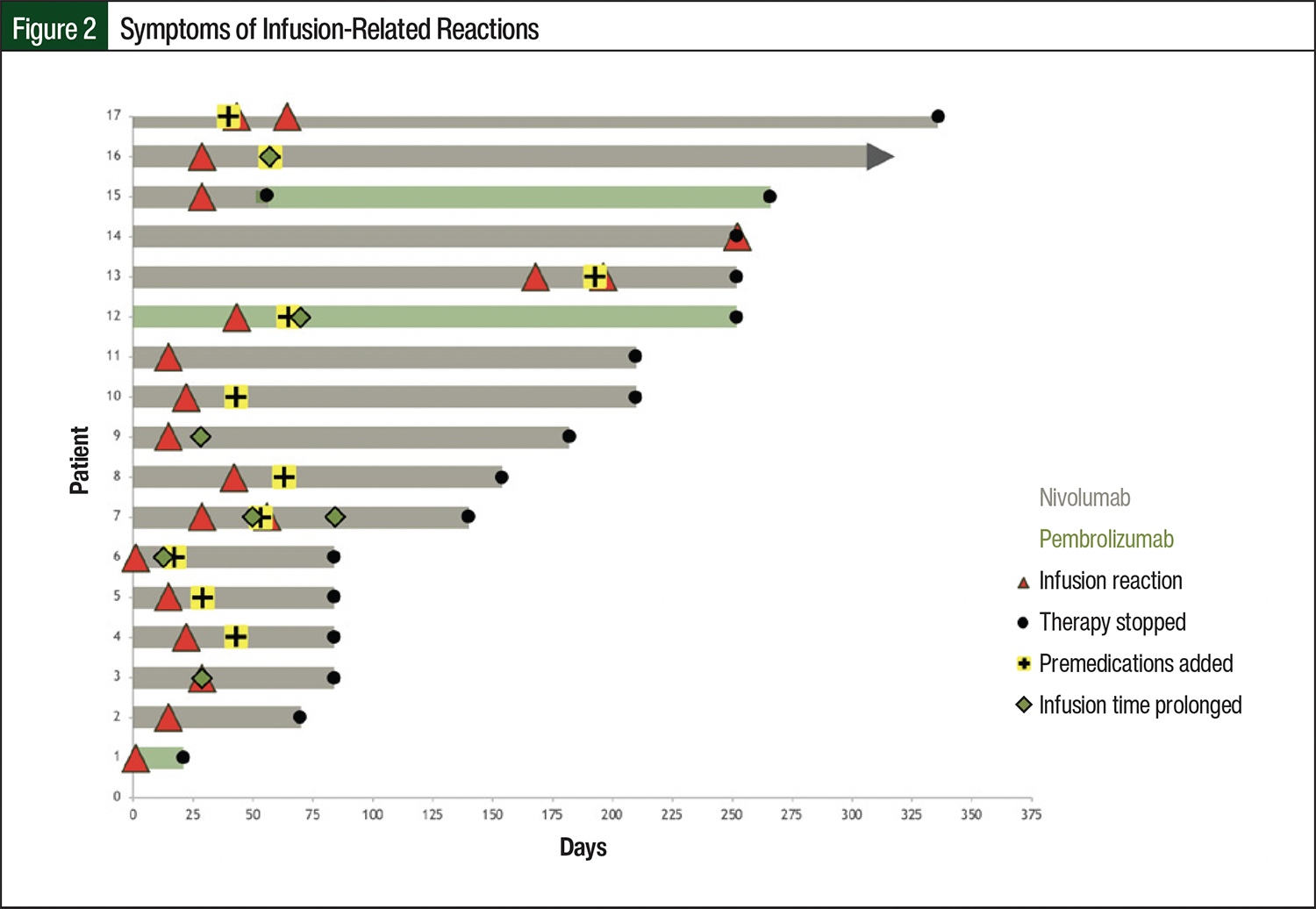 The use of programmed cell death protein 1 (PD-1) inhibitors has significantly increased as a promising therapy in cancer treatment.1 Clinical trials have shown that infusion-related reactions (IRRs) associated with PD-1 inhibitors, particularly nivolumab and pembrolizumab, occur at relatively low rates. In combined results of safety trials, IRRs range from 0.5% to 6.4% with nivolumab and approximately 3% with pembrolizumab.2,3 These reactions can occur throughout the treatment course and range in severity from mild to anaphylactic-like reactions, although severe reactions were observed in <1% of patients.2-4 The prescribing information for pembrolizumab and nivolumab recommends appropriate measures, such as interrupting or slowing down the infusion rate for grade 1 or 2 IRRs, and discontinuing the agent permanently for grade 3 or 4 reactions.3,4