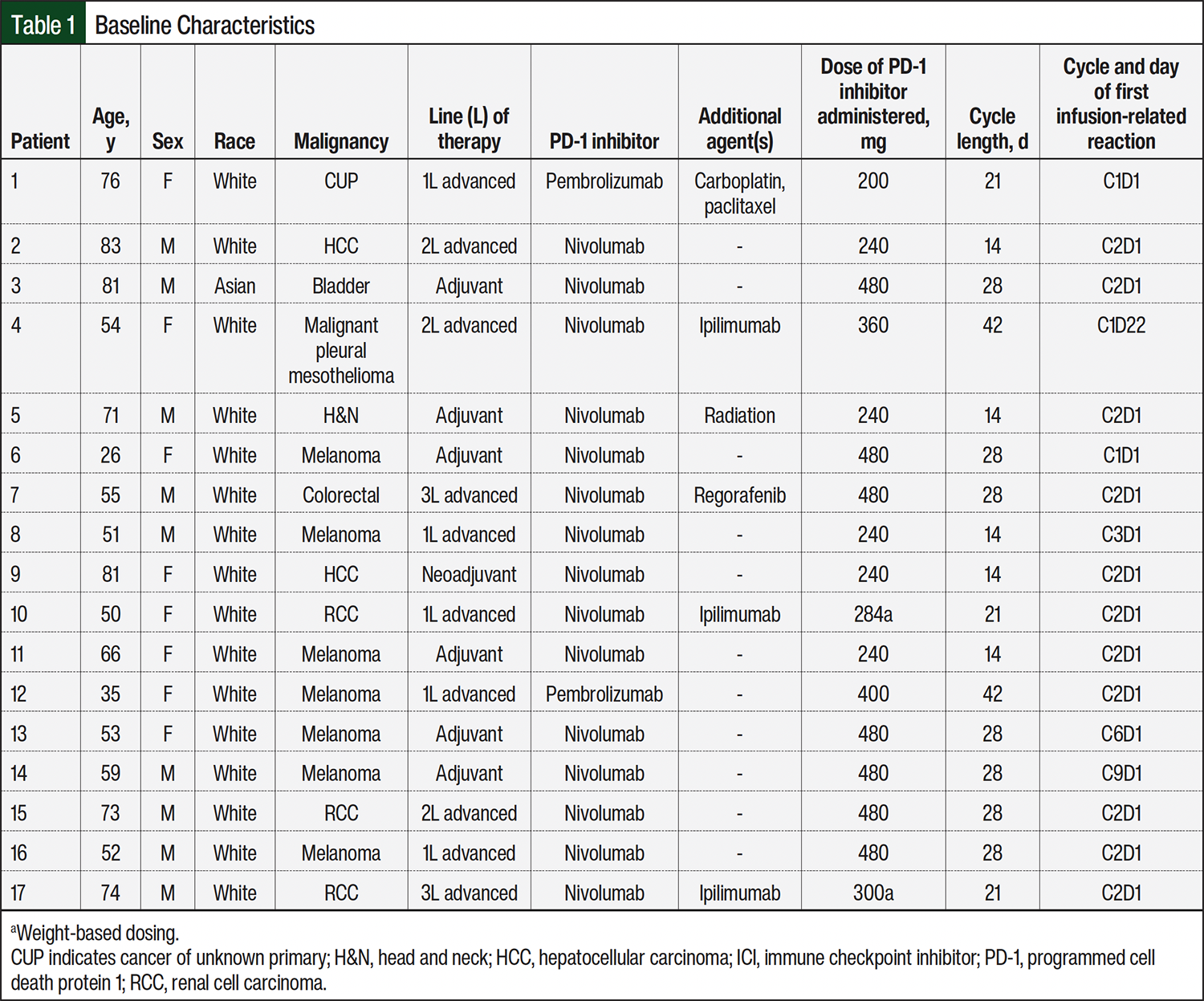 The median age of patients who had an IRR was 59 years (range, 26-83), with 9 men and 8 women. The underlying malignancies comprised melanoma (n=7), renal cell carcinoma (n=3), hepatocellular carcinoma (n=2), head and neck cancer (n=1), bladder cancer (n=1), colorectal cancer (n=1), mesothelioma (n=1), and cancer of unknown primary (n=1). The median dose of nivolumab was 360 mg (range, 240-480 mg), and the median dose of pembrolizumab was 300 mg (range, 200-400 mg). Fifteen patients received flat dosing, whereas 2 patients received weight-based dosing. Additional details regarding baseline characteristics are provided in Table 1.