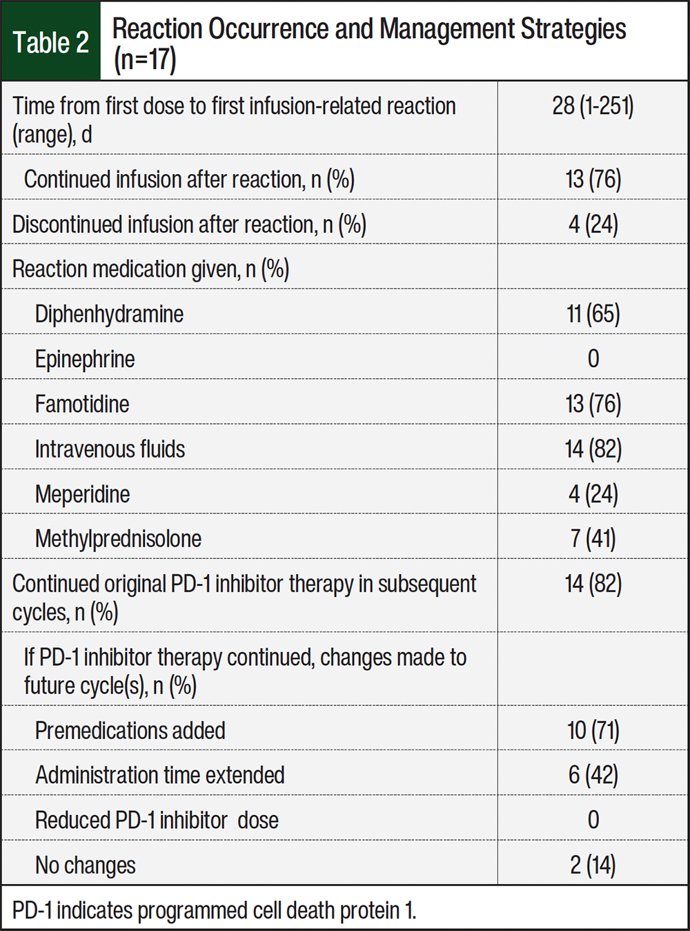Of the 14 patients who continued PD-1 inhibitor therapy, 5 had recurrent reactions despite modifications to their subsequent treatment plans. Of these patients, 4 had reactions with the next dose but tolerated all subsequent doses. However, 1 patient did not receive future doses of nivolumab after having 2 reactions; 1 patient switched from nivolumab to pembrolizumab and tolerated the infusions without further incidents; 1 patient discontinued nivolumab due to disease progression; and 1 patient discontinued treatment as their cancer diagnosis was changed from cancer of unknown primary to bladder cancer.