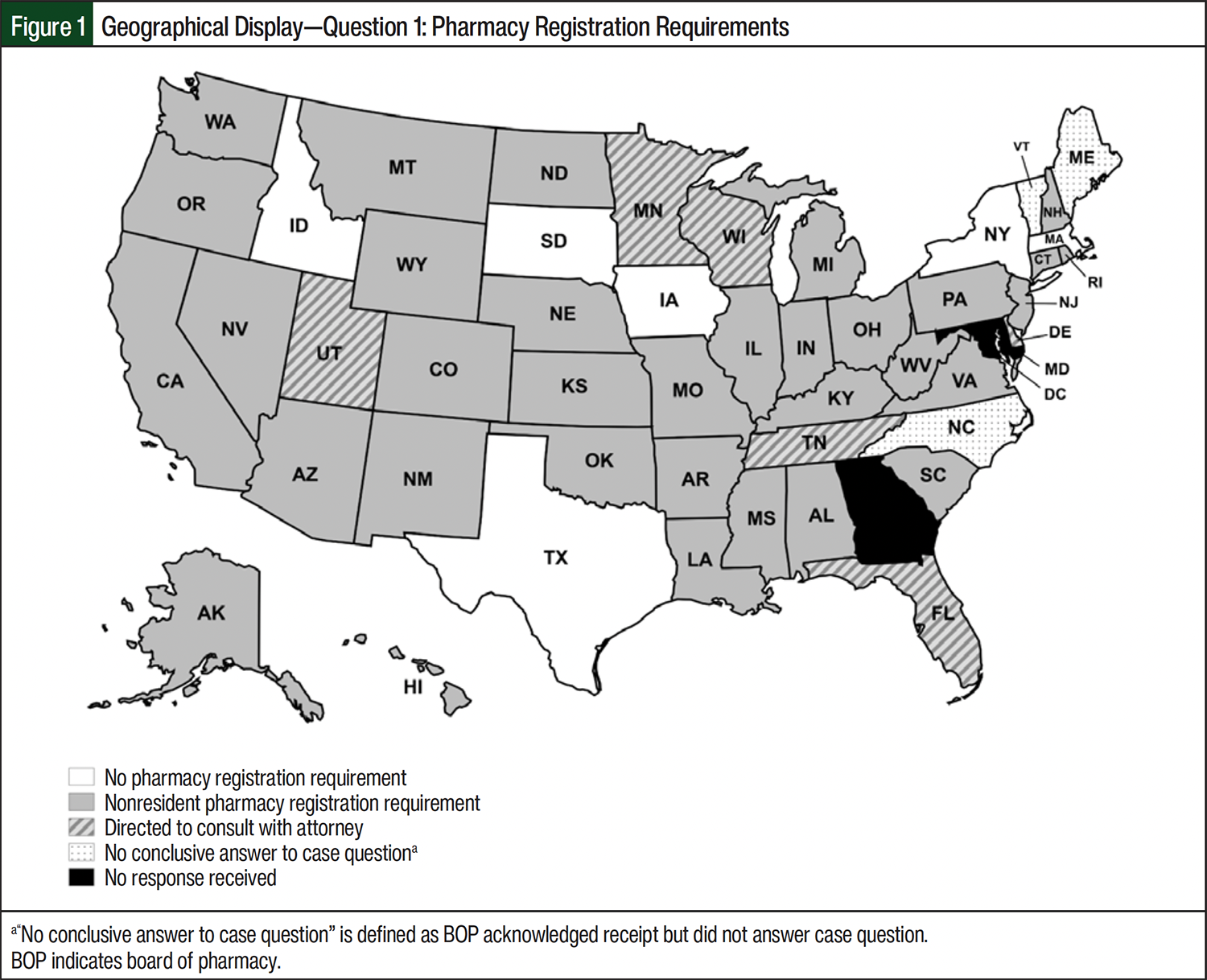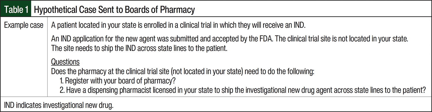 Investigational Drug Services (IDS) pharmacies are responsible for state and federal regulatory compliance when dispensing and shipping investigational agents.12 From a federal perspective, the FDA Code of Federal Regulations (CFR) Title 21, Section 312.1 jurisdiction states that “An investigational new drug for which an IND is in effect in accordance with this part is exempt from the premarketing approval requirements that are otherwise applicable and may be shipped lawfully for the purpose of conducting clinical investigations of that drug.”17 Nevertheless, IDS pharmacies must comply with state and federal law when shipping INDs across state lines. Previously, in 2014, Chelsey McIntyre, PharmD, published nationwide findings regarding state boards of pharmacy (BOPs) interpretations of interstate shipping laws for non-INDs that do not fall under the FDA CFR Title 21, Section 312.1 jurisdiction.18 To date, there has not been a nationwide assessment of state BOPs interpretations of interstate shipping laws for INDs. This study aims to fill that gap in the literature by providing information on the 50 US state-level BOPs regulatory requirements for interstate shipment of INDs dispensed by pharmacies.