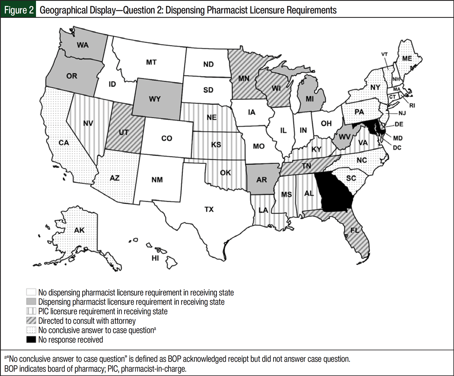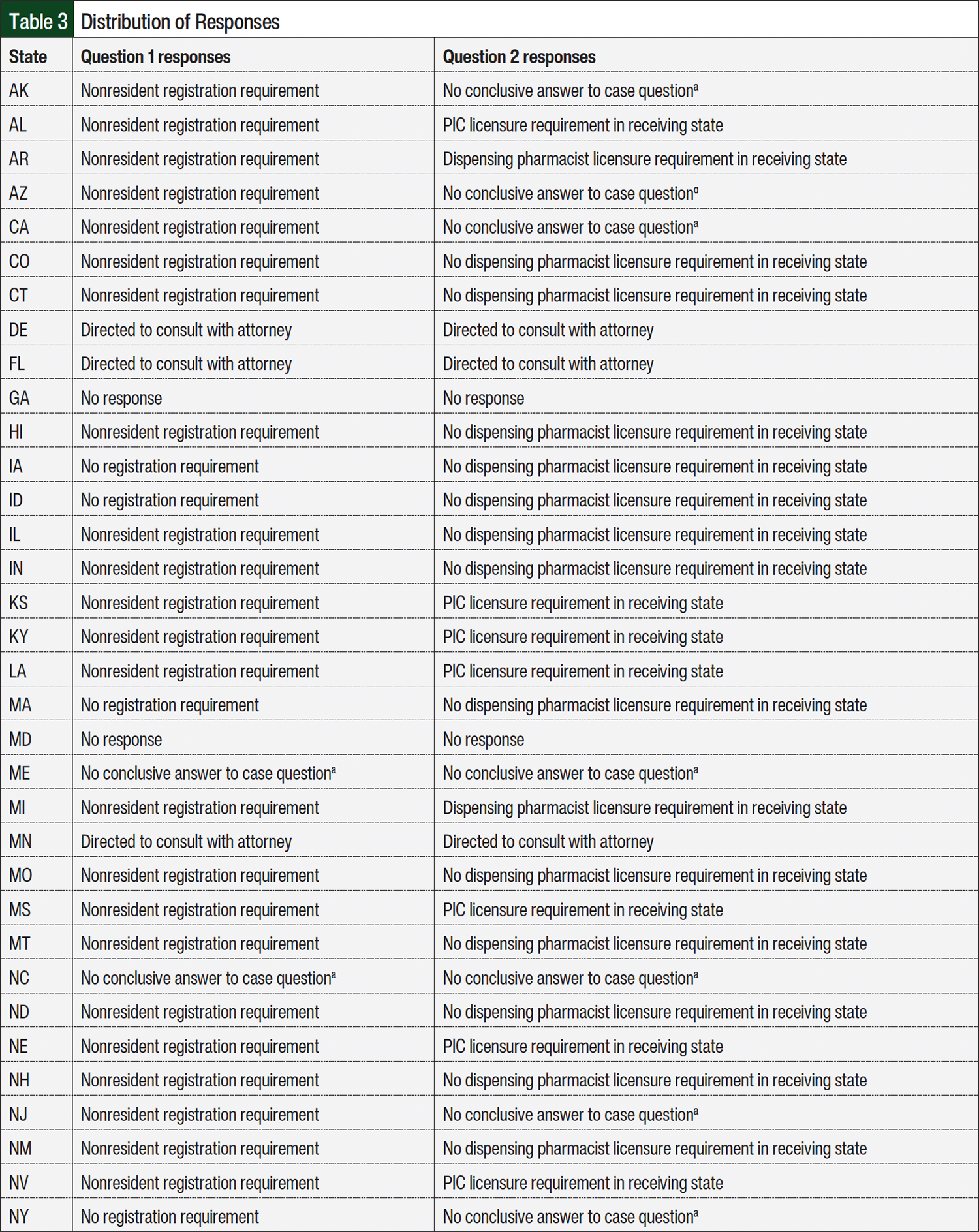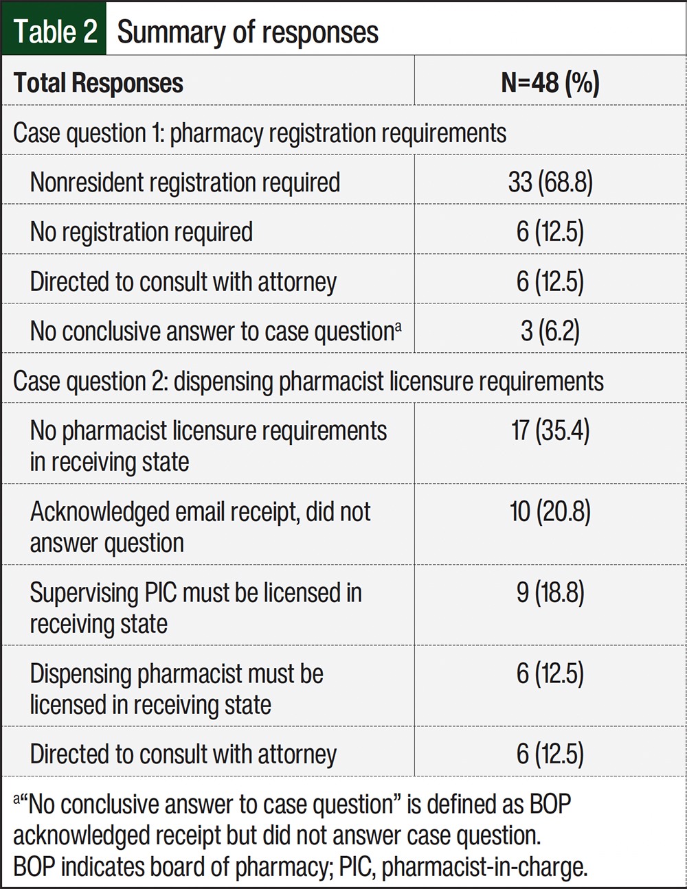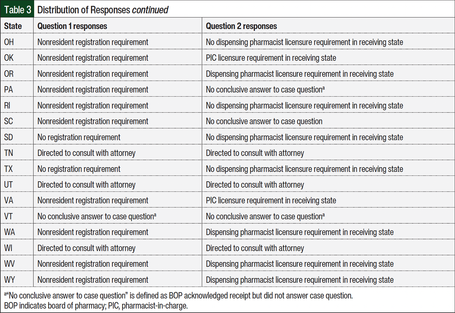 Question 2 inquired about the state BOPs dispensing pharmacist licensure requirements to ship into their respective states. Pharmacist licensure refers to the receiving state BOP requirement for the dispensing pharmacist or pharmacist-in-charge (PIC) to hold an active pharmacist license to practice pharmacy within the receiving state. Nearly one-third of state BOPs responses, 15 (31.3%) of 48, indicated pharmacist licensing requirements for the out-of-state pharmacist before shipping INDs into the state. Of those 15 responses, 9 (60%) of 15 BOPs required that the out-of-state PIC be licensed in the state to which the IND would be shipped. The other 6 (40%) of 15 BOPs required that the out-of-state dispensing pharmacist be licensed in the state to which the IND would be shipped. Seventeen (35.4%) of the 48 state BOPs responses indicated no requirements for pharmacist licensure to ship INDs into the state if the dispensing pharmacist held a license in good standing in the state where the IDS pharmacy was located. The remaining 16 (33.3%) of 48 BOPs either recommended that the IDS pharmacy consult with an attorney (6 [12.5%] of 48) or did not provide an answer to scenario case question 2 (10 [20.8%] of 48).