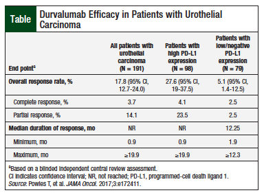 - Powles T, O’Donnell PH, Massard C, et al. Efficacy and safety of durvalumab in locally advanced or metastatic urothelial carcinoma: updated results from a phase 1/2 open-label study. JAMA Oncol. 2017;3:e172411.