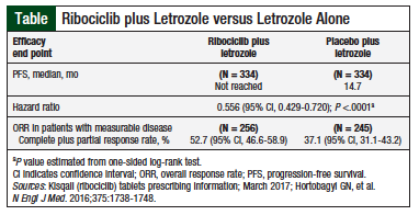 On March 13, 2017, the US Food and Drug Administration (FDA) approved ribociclib (Kisqali; Novartis), an oral CDK4/CDK6 inhibitor, in combination with letrozole for the treatment of postmenopausal women with HR-positive, HER2-negative advanced breast cancer.6,7 The FDA approval of ribociclib was based on results of a randomized study showing that ribociclib plus letrozole significantly improves PFS and overall response rate compared with letrozole plus placebo.6-8