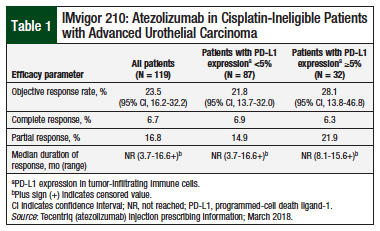 The efficacy of atezolizumab as front-line treatment in cisplatin-ineligible patients with locally advanced or metastatic urothelial carcinoma was established in a cohort of the open-label, multicenter, phase 2 IMvigor 210 clinical trial.10 Patients were considered cisplatin-ineligible if they had impaired renal function (creatinine clearance of >30 mL/min but <60 mL/min), Eastern Cooperative Oncology Group performance status 2, hearing loss of ≥25 dB at 2 contiguous frequencies, or grade ≥2 peripheral neuropathy. Key efficacy measures were objective response rate (ORR), duration of response, and overall survival (OS).10