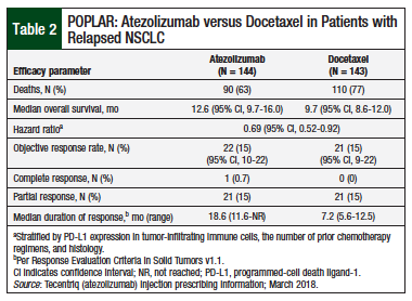 In the POPLAR study, after a median follow-up of 22 months, patients who received atezolizumab had significantly longer OS versus patients who received docetaxel: 12.6 months (95% CI, 9.7-16.0) versus 9.7 months (95% CI, 8.6-12.0), respectively (Table 2).11 Although the ORR findings were similar, the duration of response was significantly longer in patients who received atezolizumab (18.6 months) than in patients who received docetaxel (7.2 months).11