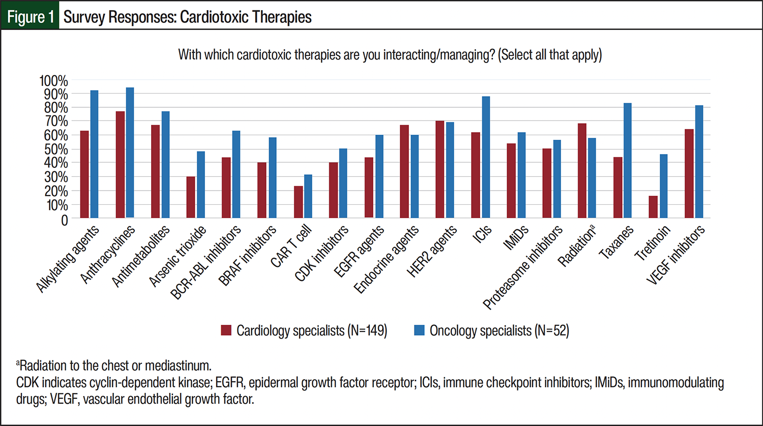 In 2015, Sulpher and colleagues conducted a 2-part, email-based survey of HCPs who manage cardiac disease in patients with cancer.6 The survey yielded 393 responses, and the results revealed differing opinions between cardiologists and oncologists regarding a formal definition of cardiotoxicity and the diagnosis, management, and monitoring of CTR-CVTs.6 In 2019, Peng and colleagues published the results of a 45-question survey completed by cardiologists, oncologists, and other providers (such as cardio-oncologists, pediatric oncologists, radiation oncologists, nurse practitioners, and pharmacists, among others).7 This survey yielded 160 responses, and the results again demonstrated a disconnect between cardiologists and oncologists regarding the prevention of and treatment strategies for CTR-CVTs.7 Although these surveys demonstrate a disconnect between cardiologists and oncologists in various aspects of CTR-CVT management, perceived educational needs were not addressed.