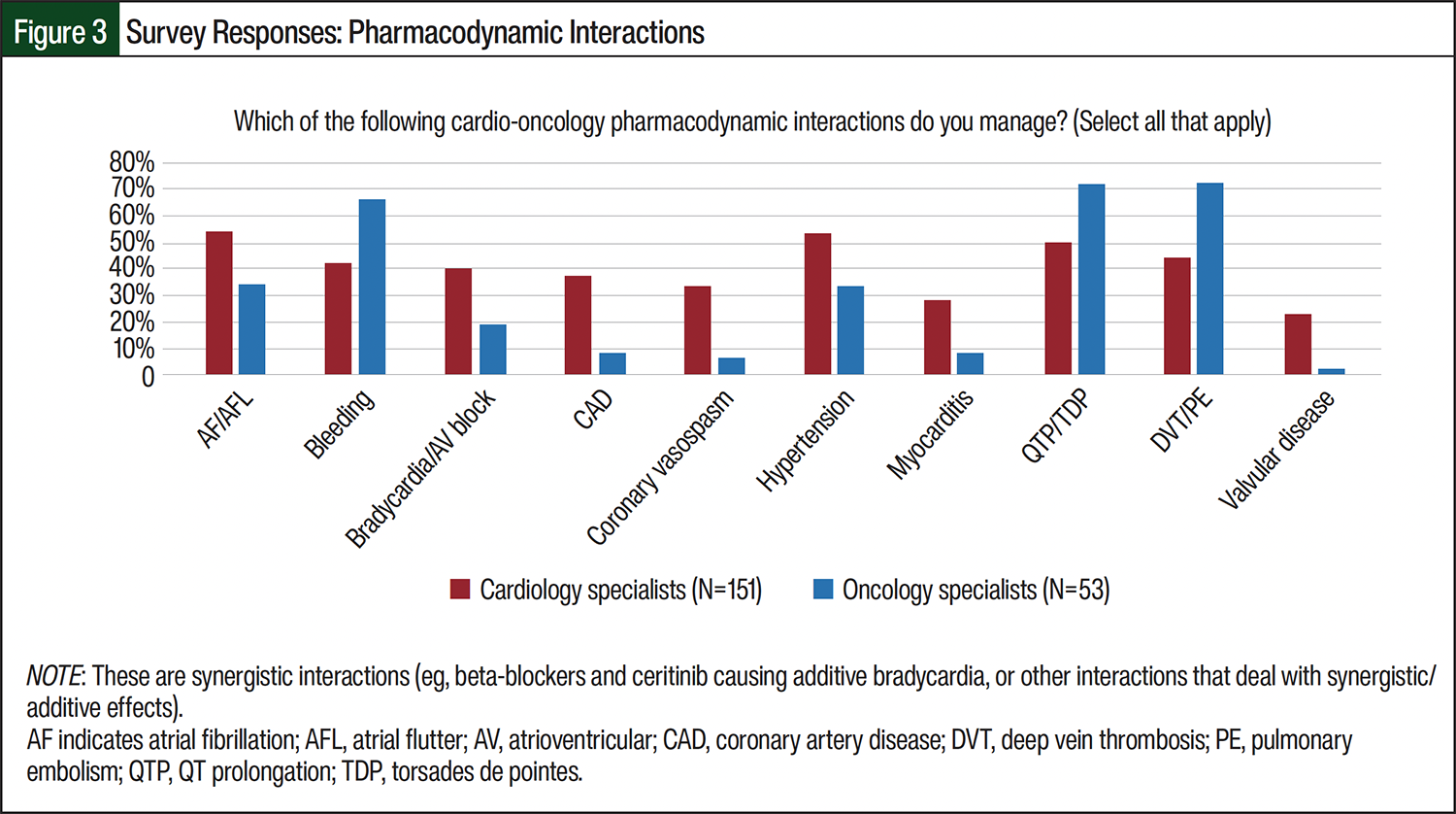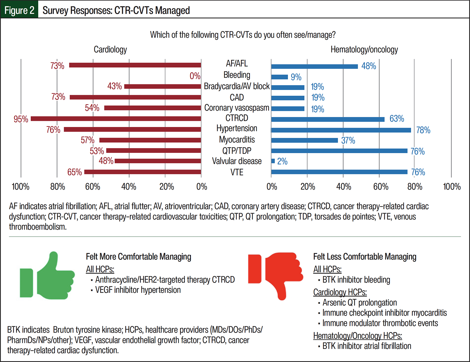 The results of the IC-OS Pharmacy Workgroup survey showed that cardiologists and oncologist/hematologists often manage CTR-CVTs, except for bleeding. As anticipated, cardiologists managed these CTR-CVTs more frequently (43%-95%), whereas the management of CTR-CVTs was less common and more variable with oncologists/hematologists (2%-78%). In addition, there were differences in which these provider types felt comfortable with managing various CTR-CVTs. Although pharmacists and other HCPs felt comfortable managing anthracycline/HER2 agent–associated cardiomyopathy and VEGF inhibitor–associated hypertension, pharmacists felt more comfortable with immune modulator–associated thrombosis/thrombotic events, whereas other HCPs felt more comfortable with ibrutinib/other-associated atrial fibrillation.