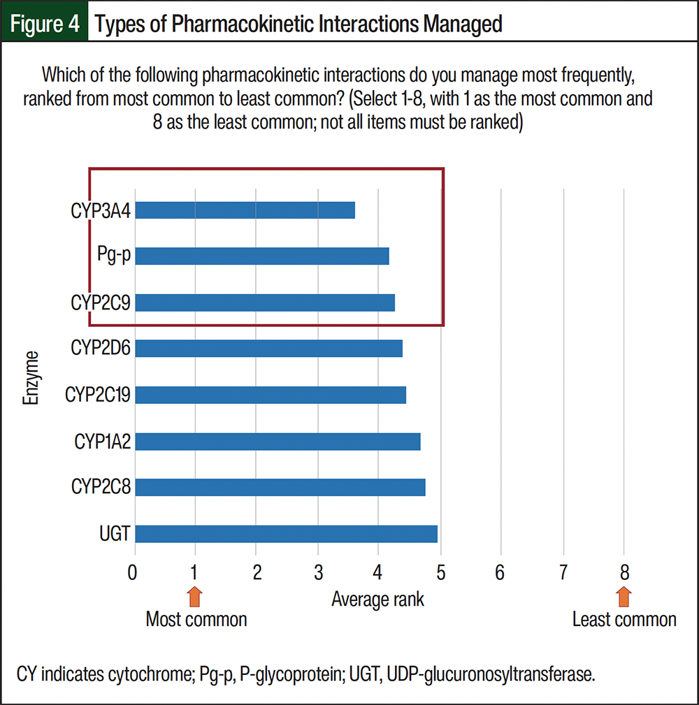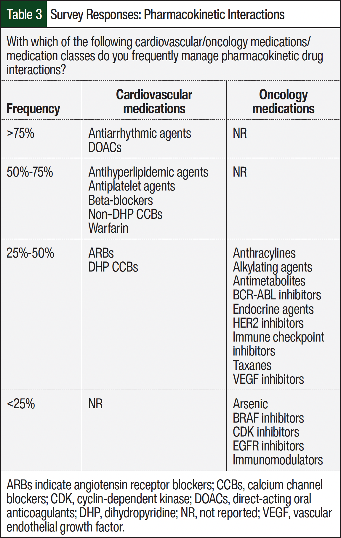 The most common cardio-oncology–related pharmacodynamic (PD) drug–drug interactions (DDIs) encountered were bleeding, hypertension, QT prolongation/torsades de pointes, and deep vein thrombosis/pulmonary embolism, and each of these was more often reported by hematologists/oncologists (Figure 3). The most prevalent types of pharmacokinetic (PK) DDIs were cytochrome (CY)P4503A4 and P-glycoprotein followed by CYP2C9 (Figure 4). Overall, cardiovascular (CV) therapies were more often associated with PK DDIs than with oncology therapies. The specific PK DDIs reported by >75% of survey participants were antiarrhythmic agents and direct-acting oral anticoagulants, followed by warfarin, antiplatelet agents, antihyperlipidemic agents, beta-blockers, and nondihydropyridine calcium channel blockers, which were reported by 50% to 75% of the respondents (Table 3). Common PK DDIs with oncology therapies were widespread across 9 medication categories (Table 3). Overall, the survey participants reported similar PD and PK DDIs among pharmacists and other HCPs.
