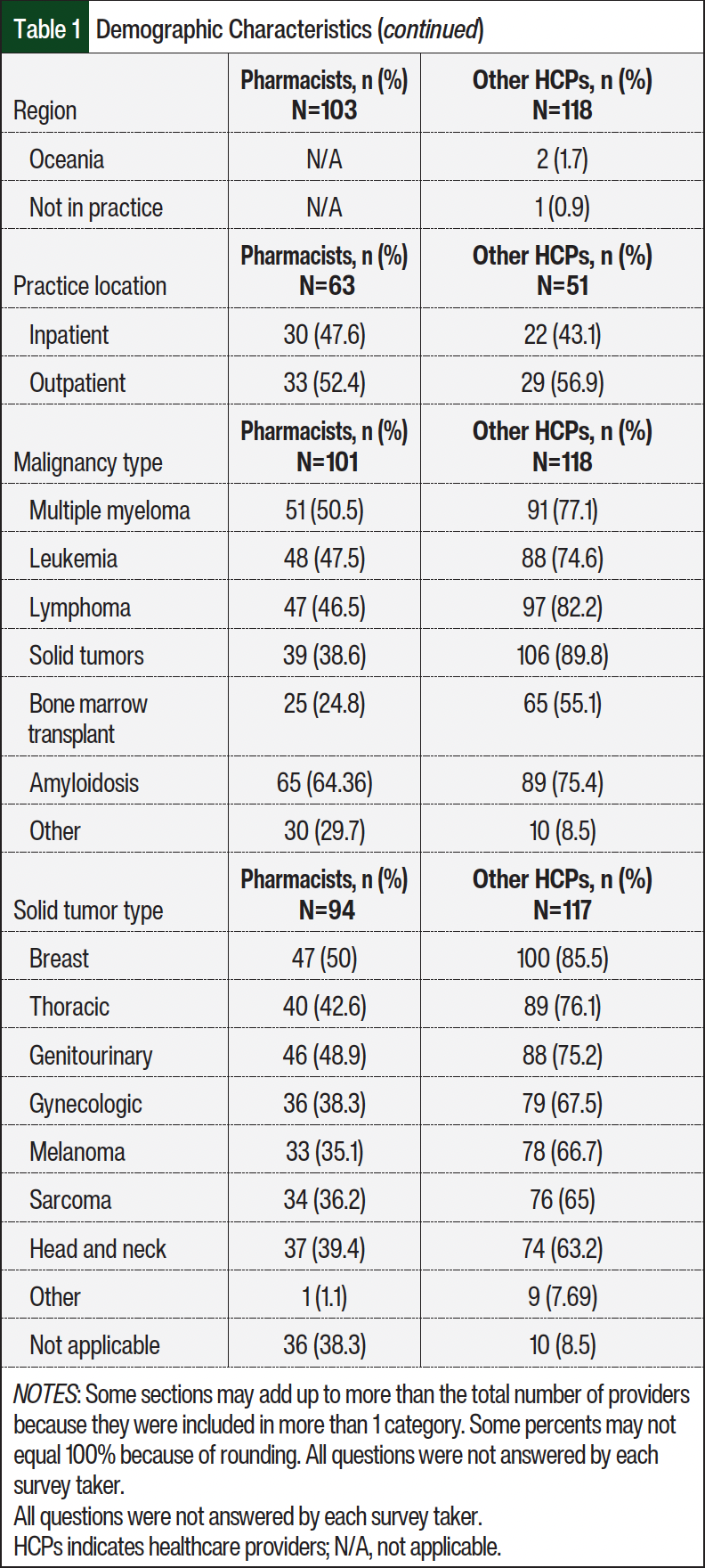 Of the 220 survey respondents, approximately 46% were pharmacists and 54% were other HCPs (>80% physicians; Table 1). The respondents predominately practiced in North America (59%) and Europe (20%), with most at academic medical centers (65%, academic; 35%, community) and primarily specialized in cardiology (71% cardiology, 24% oncology, 14% hematology). Cardiology and hematology/oncology HCPs included all disciplines within the specialty area (eg, physicians, pharmacists, other providers). Overall, the HCPs reported that the types of malignancies managed in their practice were primarily solid tumors (65%); however, malignant hematology management was also common (>60%; Table 1).