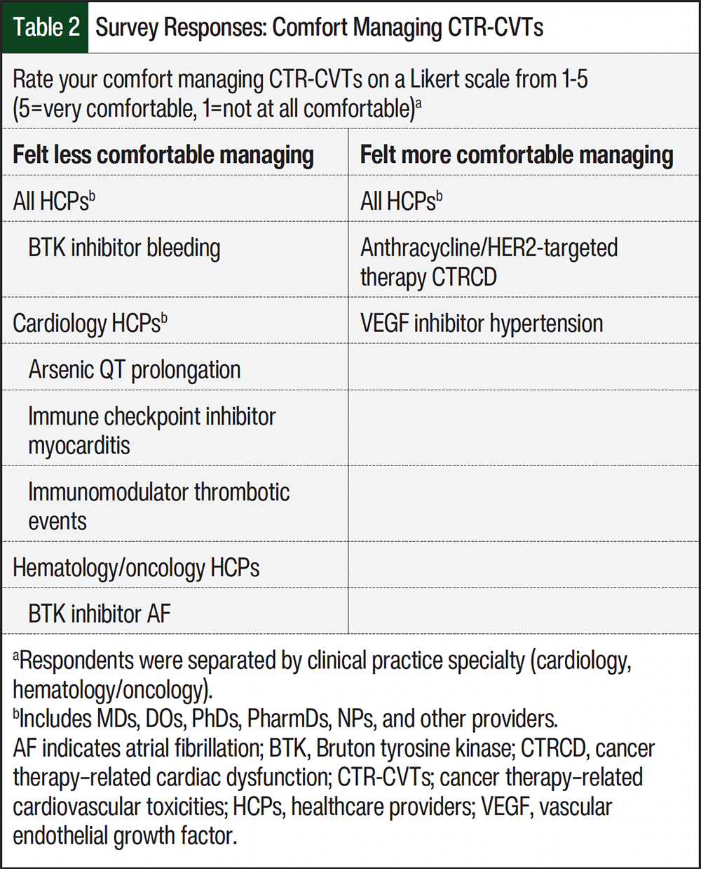 When asked to rate their overall comfort with treating CTR-CVTs on a Likert scale (1-5), with 5 being very comfortable and 1 being not at all comfortable, all HCPs were most comfortable with anthracycline/HER2-targeted therapy–associated CTRCD and VEGF inhibitor–associated hypertension (Table 2). Cardiology HCPs reported being least comfortable treating arsenic-associated QT prolongation, immune checkpoint inhibitor–associated myocarditis, and immune modulator–associated thrombotic events. In contrast, hematology/oncology HCPs reported the least comfort with treating Bruton tyrosine kinase inhibitor–associated AF. For comfort in managing all CTR-CVTs queried, pharmacists reported lower overall scores than nonpharmacists.