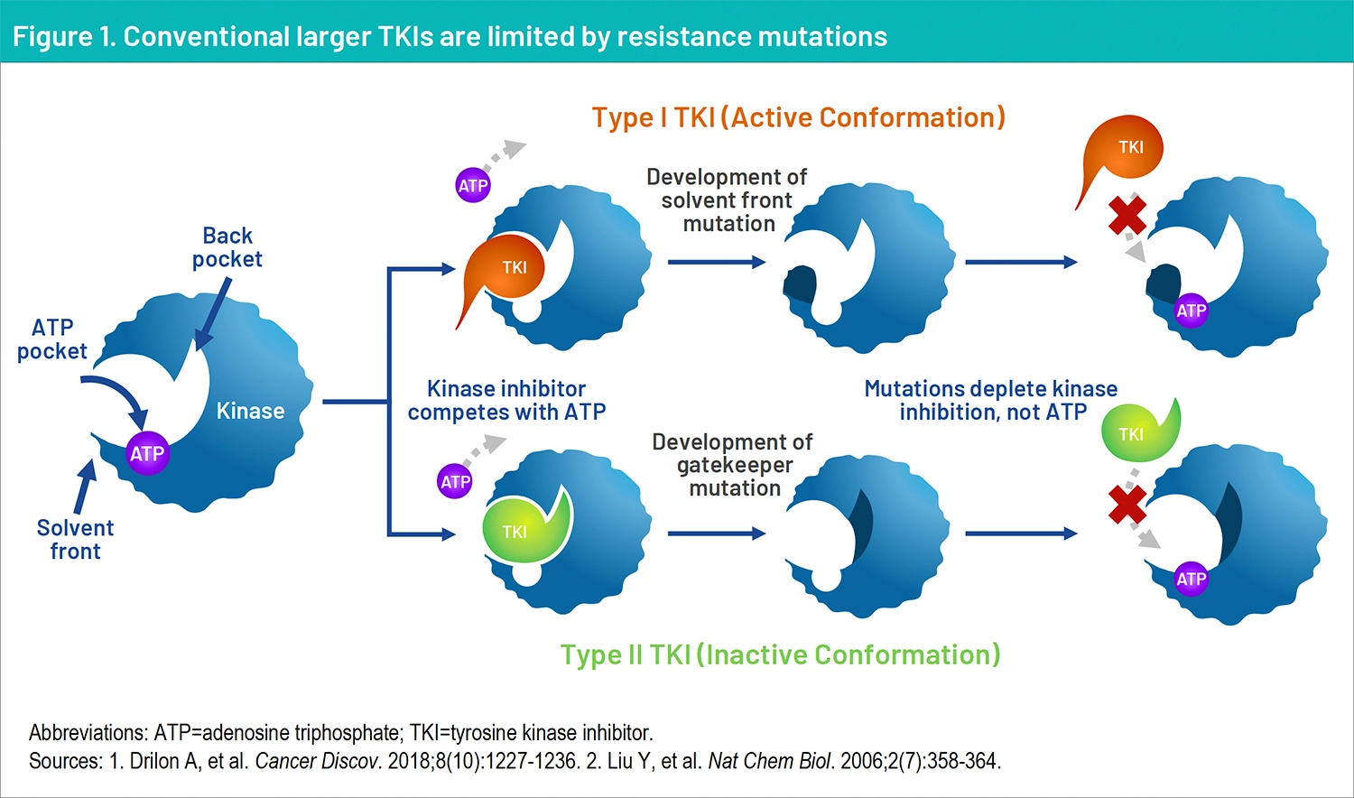 Conventional larger TKIs can be limited by resistance mutations. Treatment for patients with NSCLC harboring TKI-resistant driver mutations represents a substantial unmet need. Next-generation TKIs, developed to combat resistance mutations, have become first-line treatments.5,6