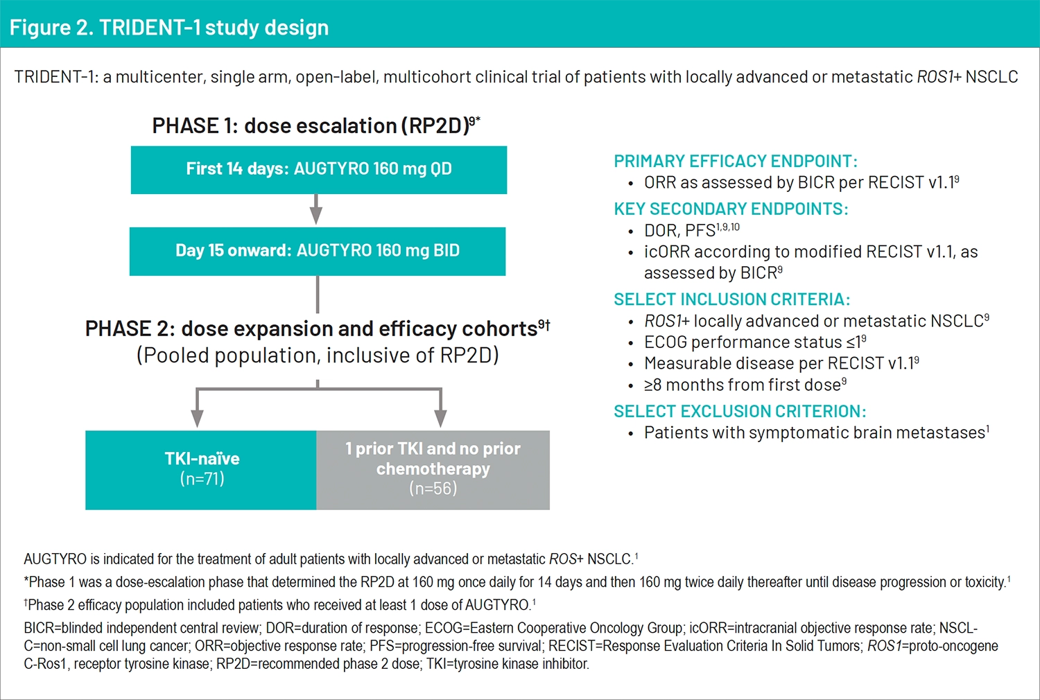 Results from the phase 1-2 TRIDENT-1 study demonstrated that AUGTYRO showed activity in patients with ROS1-positive NSCLC. AUGTYRO had durable antitumor activity based on the objective response rate and median duration of response.2 AUGTYRO was active against intracranial disease.2 The selectivity and intracranial activity of AUGTYRO underscores its unique therapeutic value.