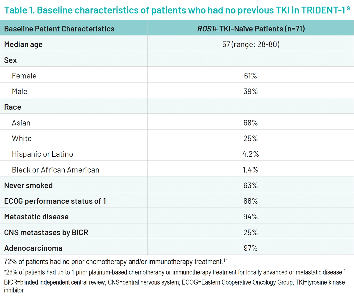 The primary endpoint of this study was objective response rate (ORR) as assessed by blinded independent central review (BICR) per RECIST version 1.1.2,9 Key secondary endpoints consisted of duration of response (DOR), progression-free survival (PFS), and intracranial objective response rate (icORR) according to modified RECIST version 1.1, as assessed by BICR.2,9 To be included in the study, patients had to have ROS1 plus locally advanced or metastatic NSCLC, and ECOG performance status ≤1, measurable disease per RECIST version 1.1, and ≥8 months from the first dose.9 Patients were excluded from the study if they had symptomatic brain metastases.9