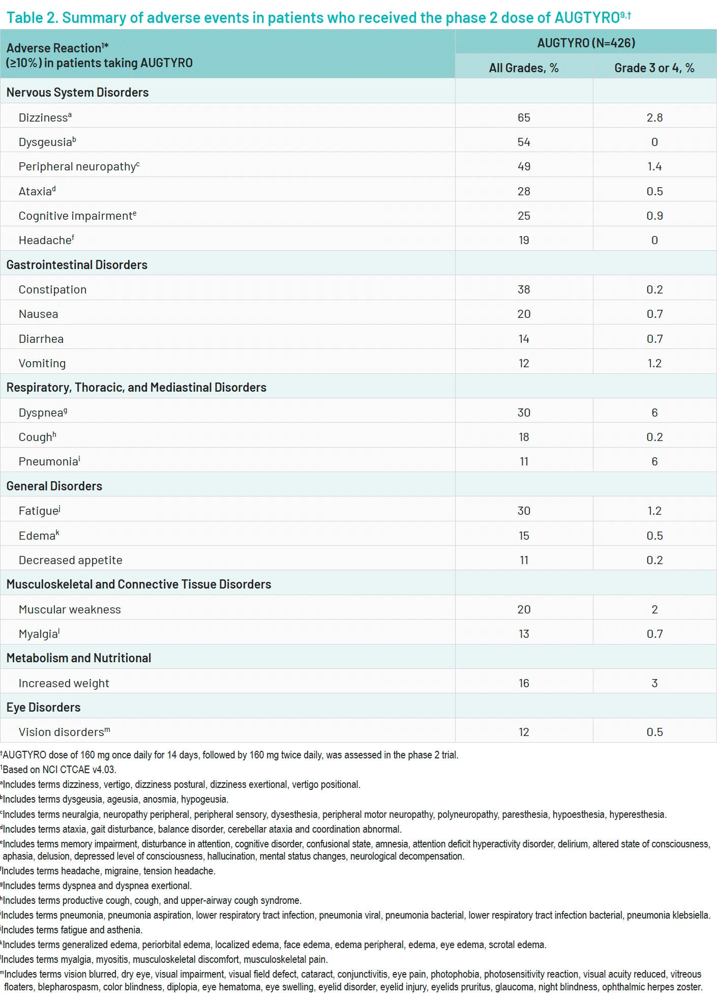 - The safety of AUGTYRO was evaluated in 426 patients in TRIDENT-1. The most common adverse reactions (≥20%) were dizziness, dysgeusia, peripheral neuropathy, constipation, dyspnea, fatigue, ataxia, cognitive impairment, muscular weakness, and nausea.