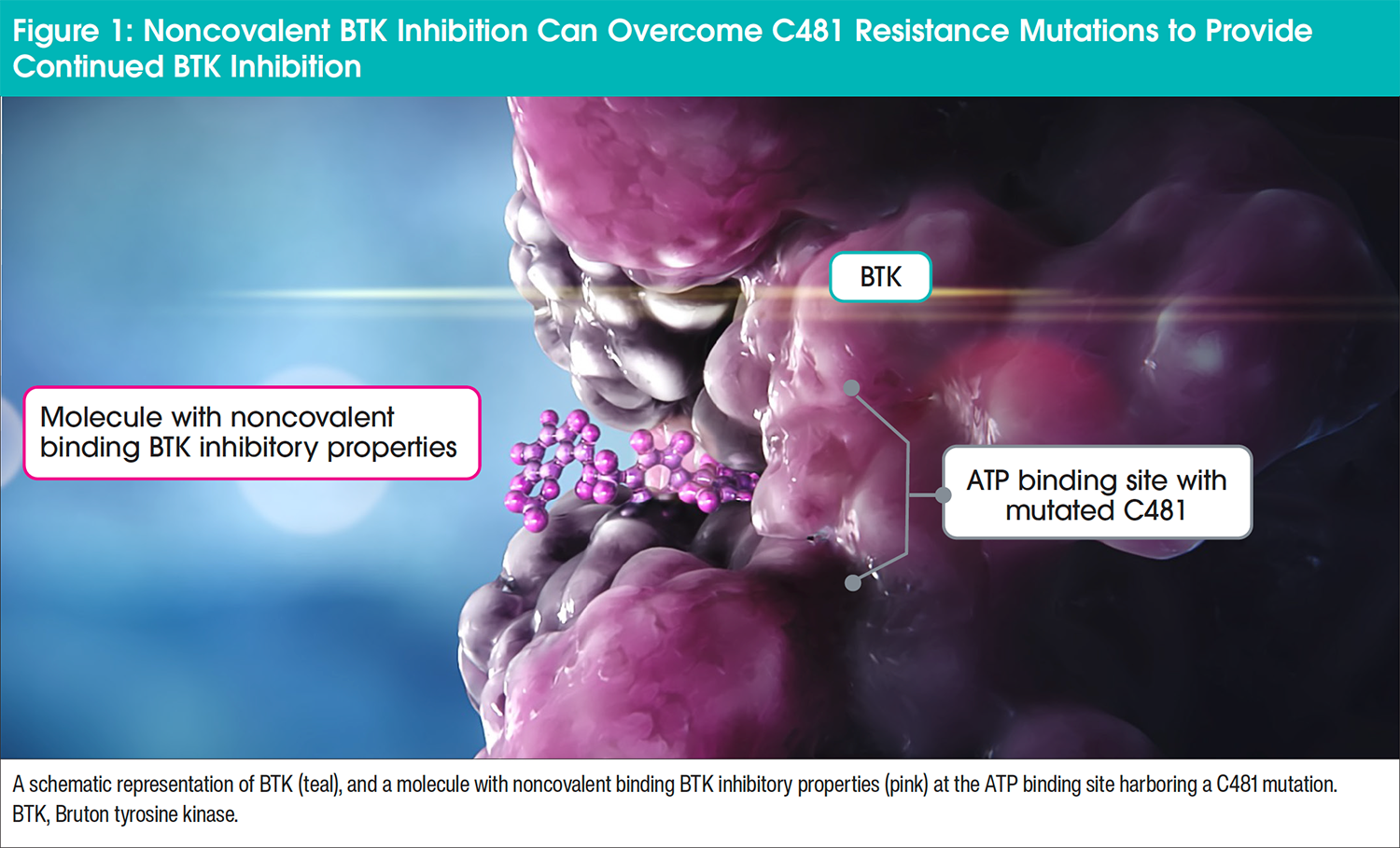 Inhibiting the BTK domain can block BTK catalytic activity, suppress downstream BCR signaling, and impair malignant B-cell survival.5,6 The kinase domain contains a C481 residue in the ATP binding site that is crucial for covalent and irreversible binding.5,7-10 By binding with C481, BTK autophosphorylation and activation is blocked, suppressing downstream BTK activity in CLL cells. Mutations in C481 are a mechanism of acquired resistance to covalent inhibition of BTK.6 Noncovalent, reversible binding is independent of the C481 residue and interacts with the target through binding, unbinding, and rebinding.10-12 Noncovalent inhibition of BTK can overcome C481 resistance, and could provide an alternate treatment option for patients who have developed resistance to a covalent BTK inhibitor (Figure 1).6,9,11