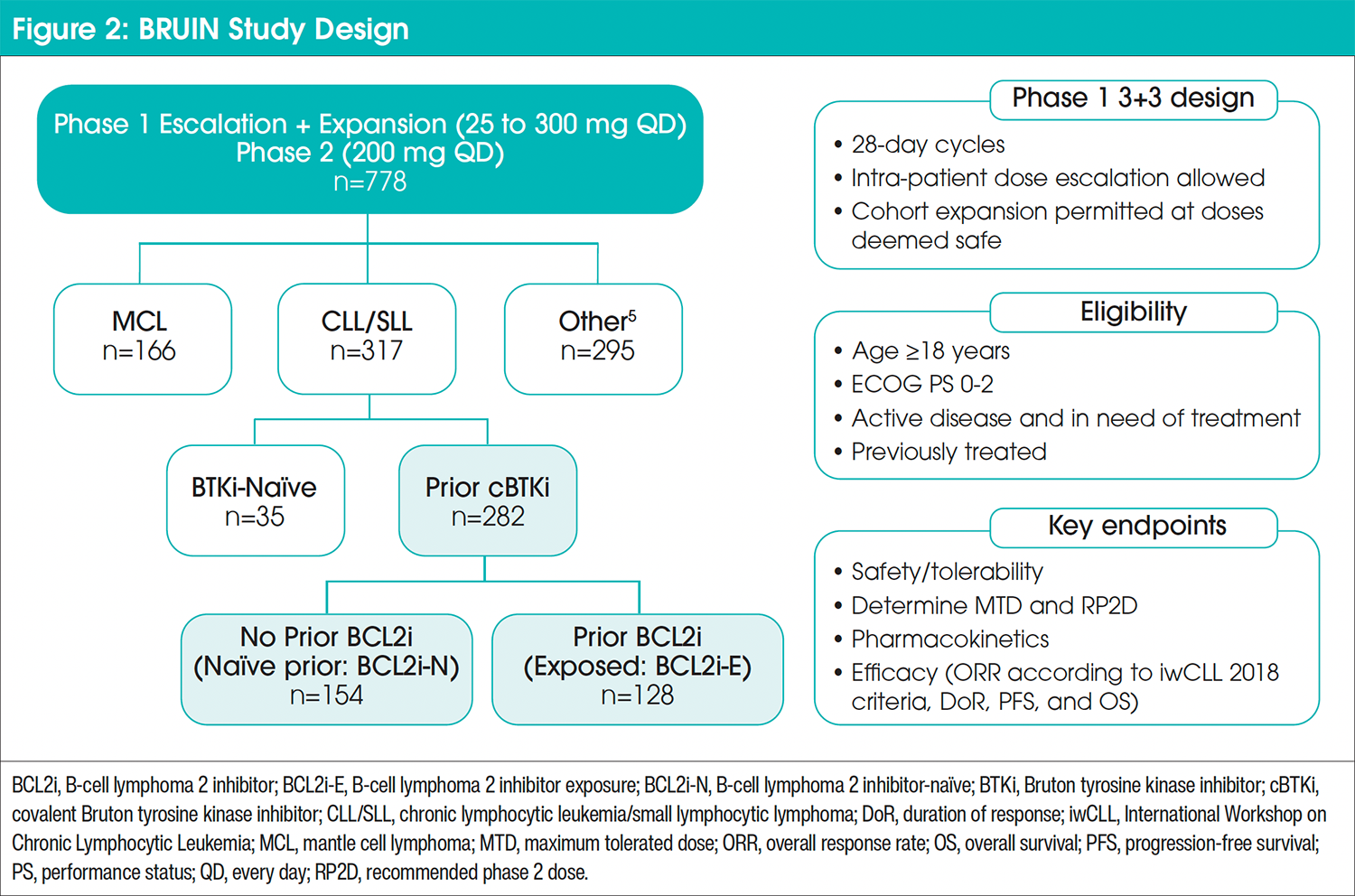 BRUIN is a phase 1/2 trial, which included the phase 1 dose-escalation and dose-expansion phases and phase 2 (Figure 2).2 In the phase 1 portion, patients received pirtobrutinib at doses ranging from 25 to 300 mg once daily in 28-day cycles.1 In the phase 2 portion, patients received the recommended dose of 200 mg once daily until disease progression, unacceptable adverse events, or patient withdrawal. Patients with disease progression could continue treatment if ongoing clinical benefit was evident, according to the investigator’s discretion.1